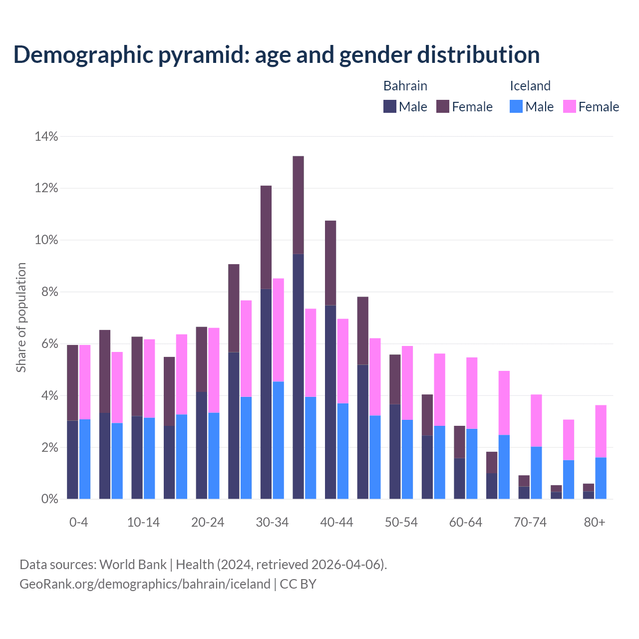 - Bahrain is ranked 80/196 by median age (oldest to youngest) vs 65/196 for Iceland.