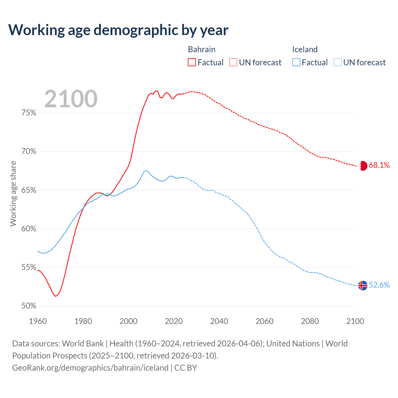 Median age Bahrain vs Iceland, 1960-2100