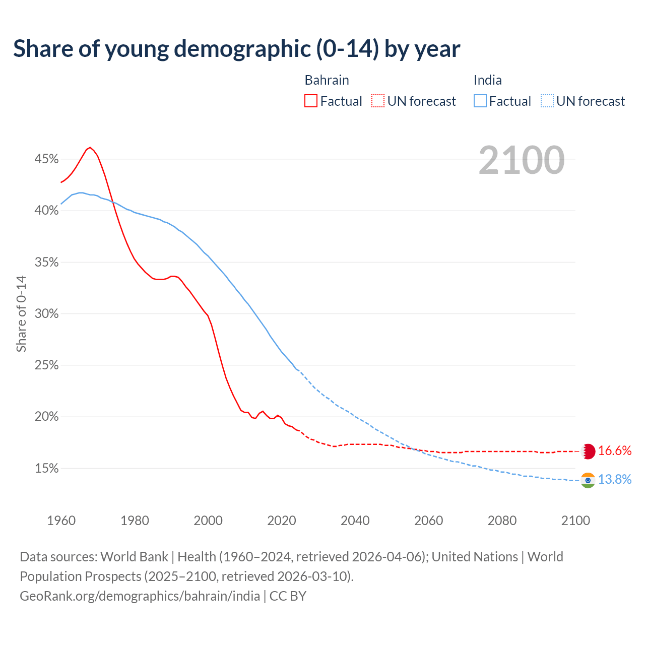 - Bahrain is ranked 80/196 by median age (oldest to youngest) vs 108/196 for India.