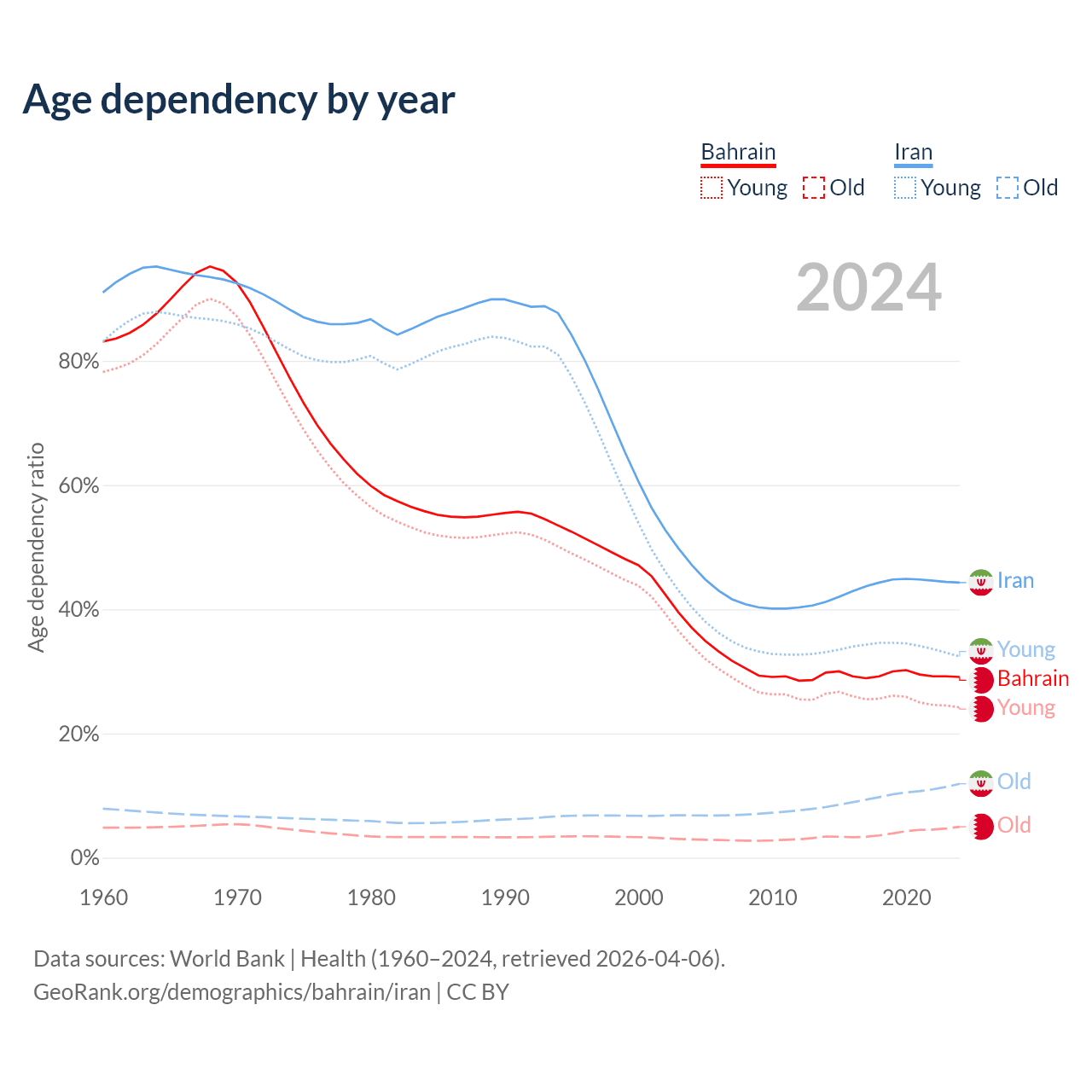 - The share of old-age demographic (65+) in Bahrain is 3.85% vs 8.24% in Iran.