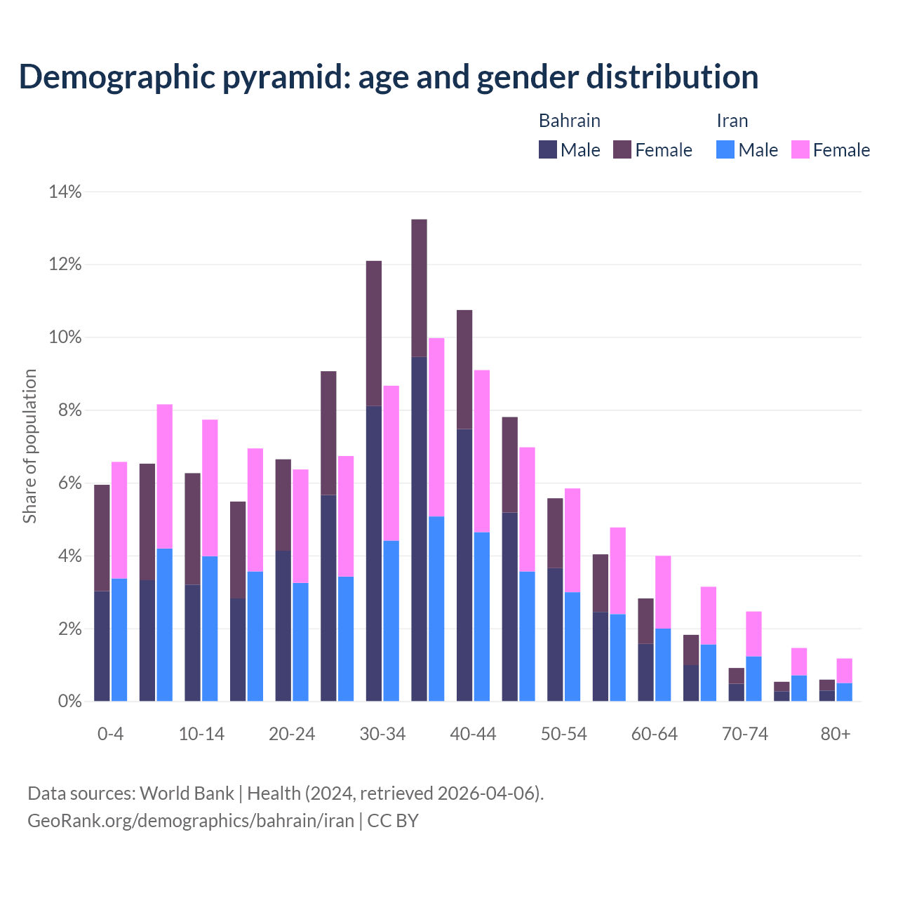 - Bahrain is ranked 80/196 by median age (oldest to youngest) vs 79/196 for Iran.