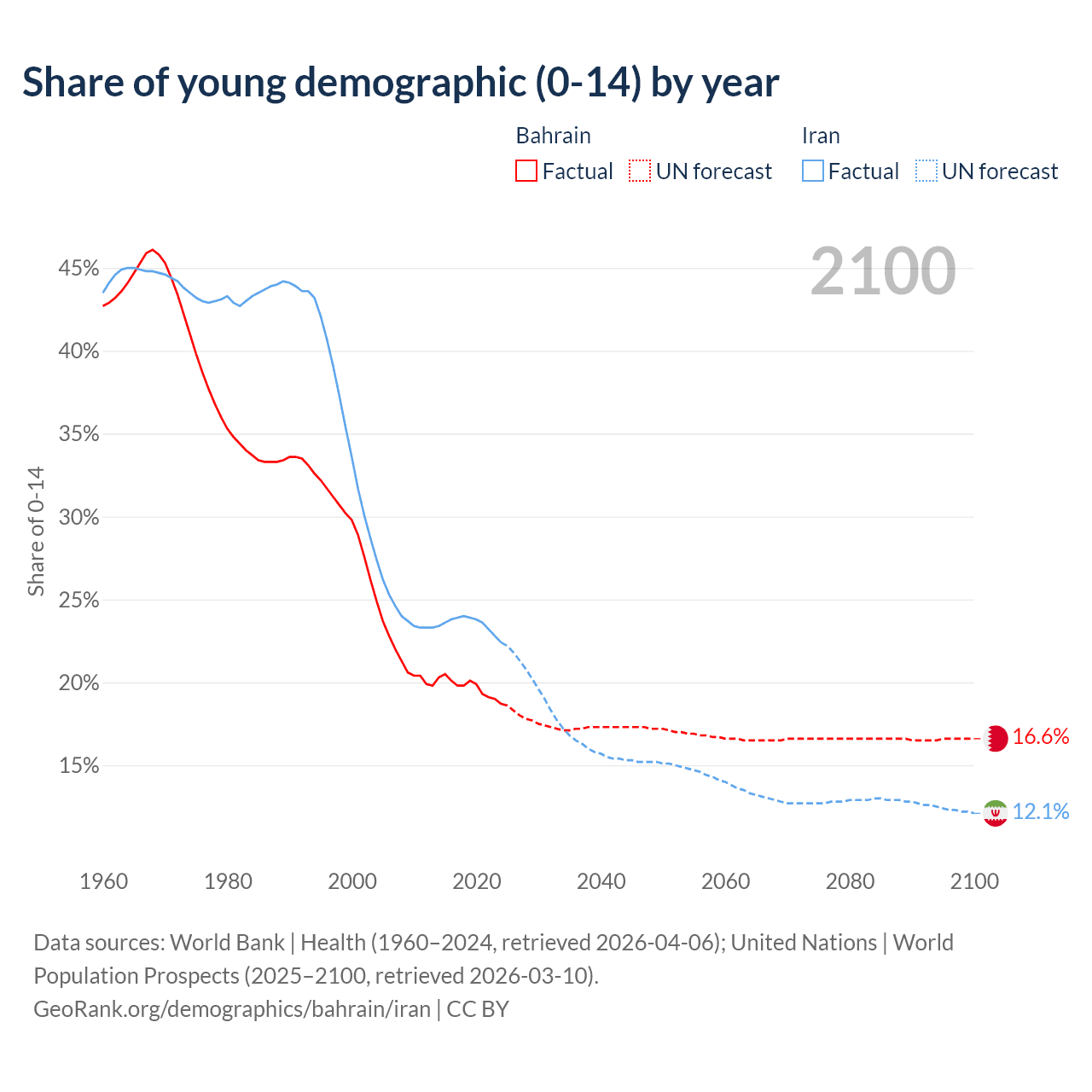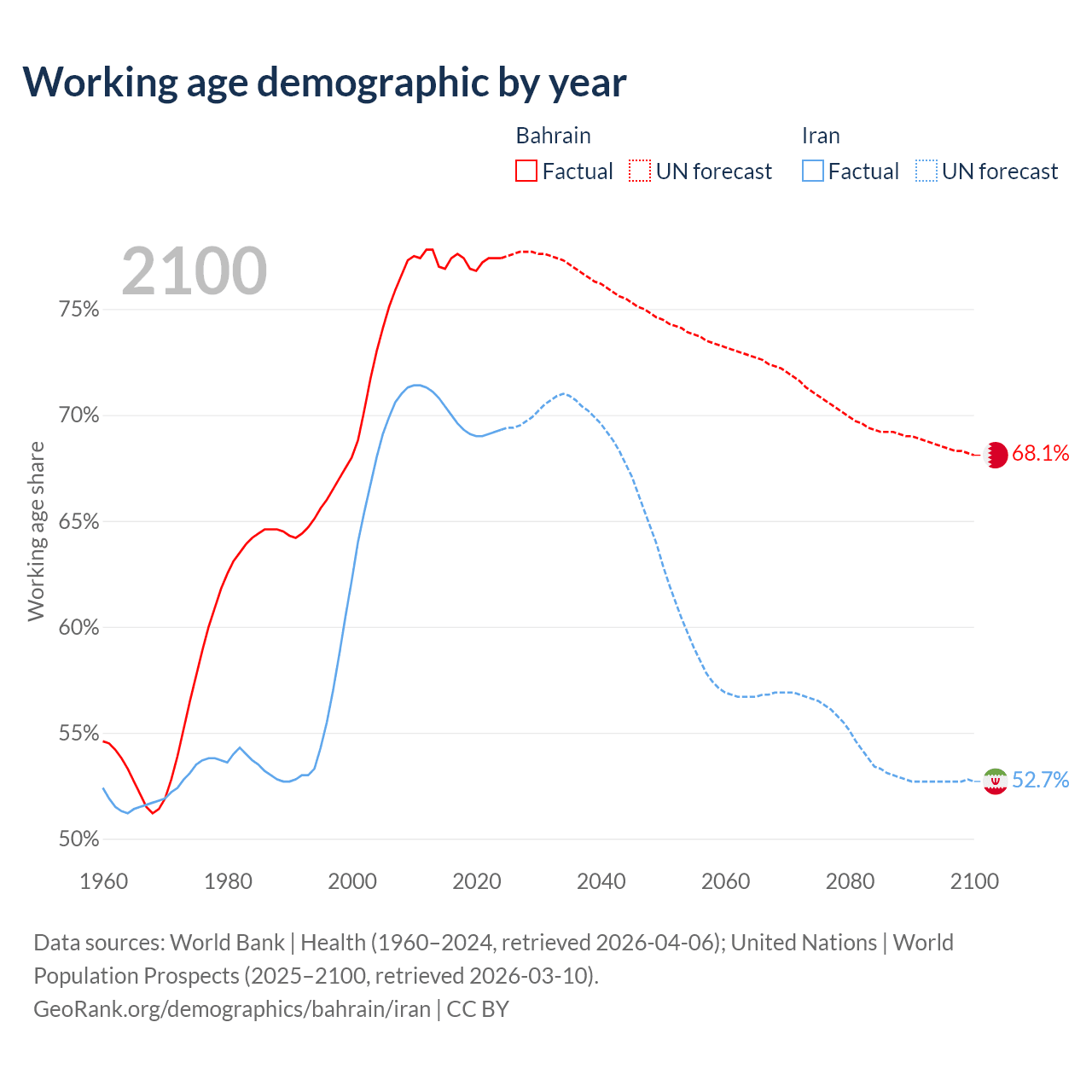 Median age Bahrain vs Iran, 1960-2100
