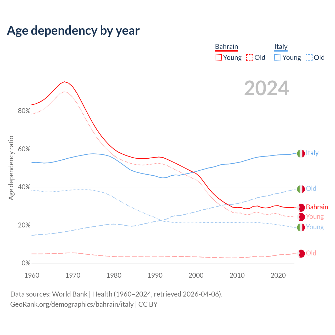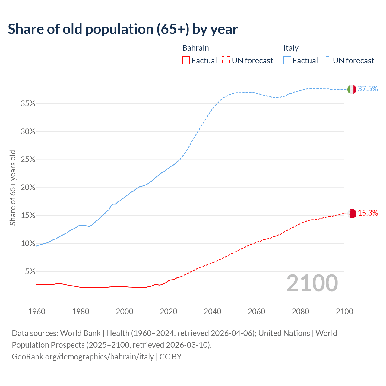 The share of older people aged 65 and over is 3.85% in Bahrain and 24.6% in Italy. Life expectancy in Bahrain compared to Italy .