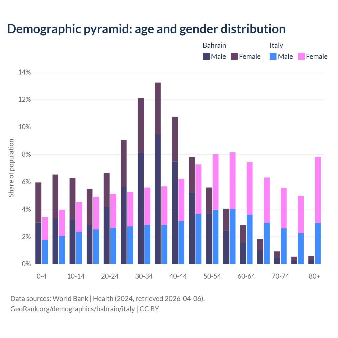- Bahrain is ranked 80/196 by median age (oldest to youngest) vs 4/196 for Italy.