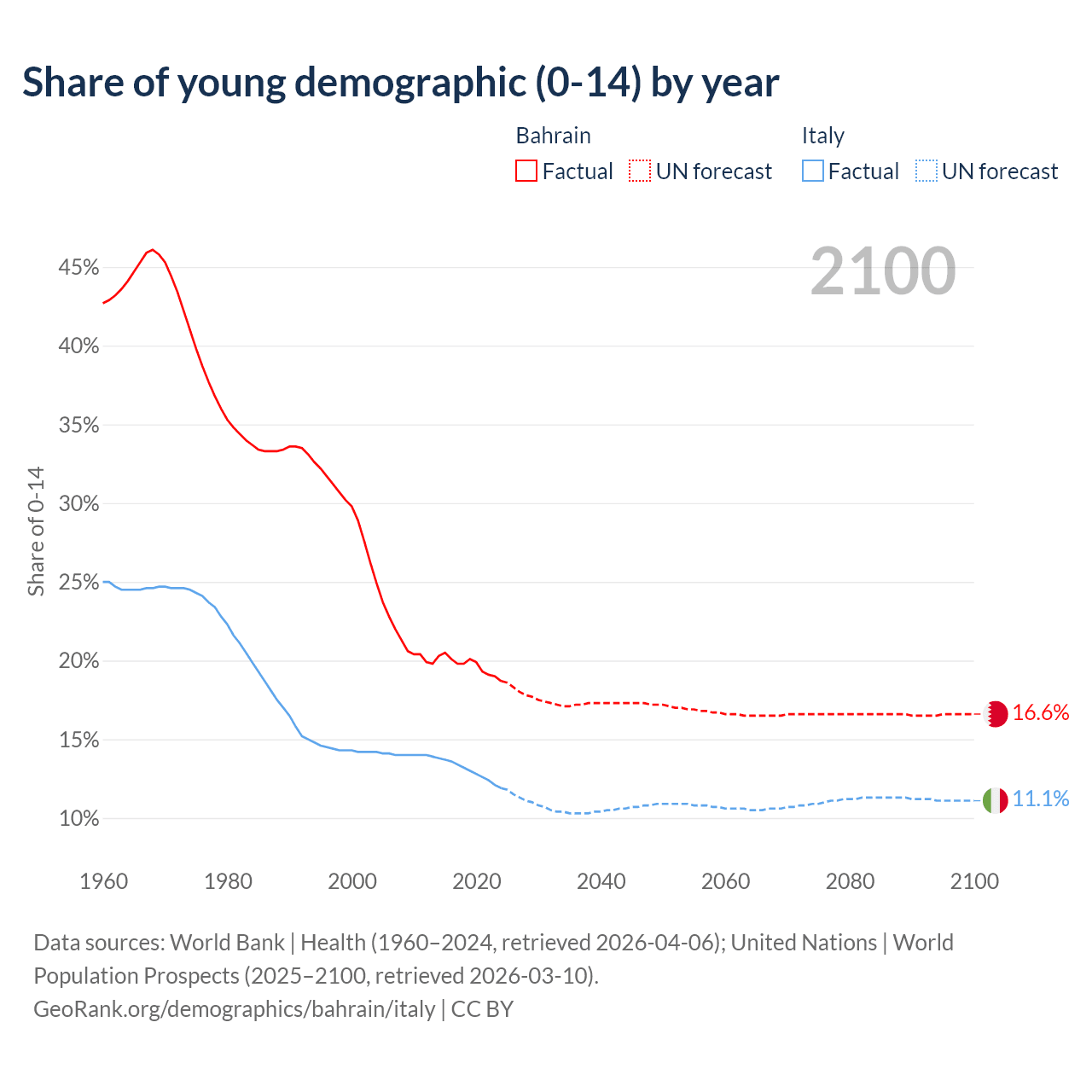 - The share of young demographic (0-15 years old) in Bahrain is 18.7% vs 11.9% in Italy.