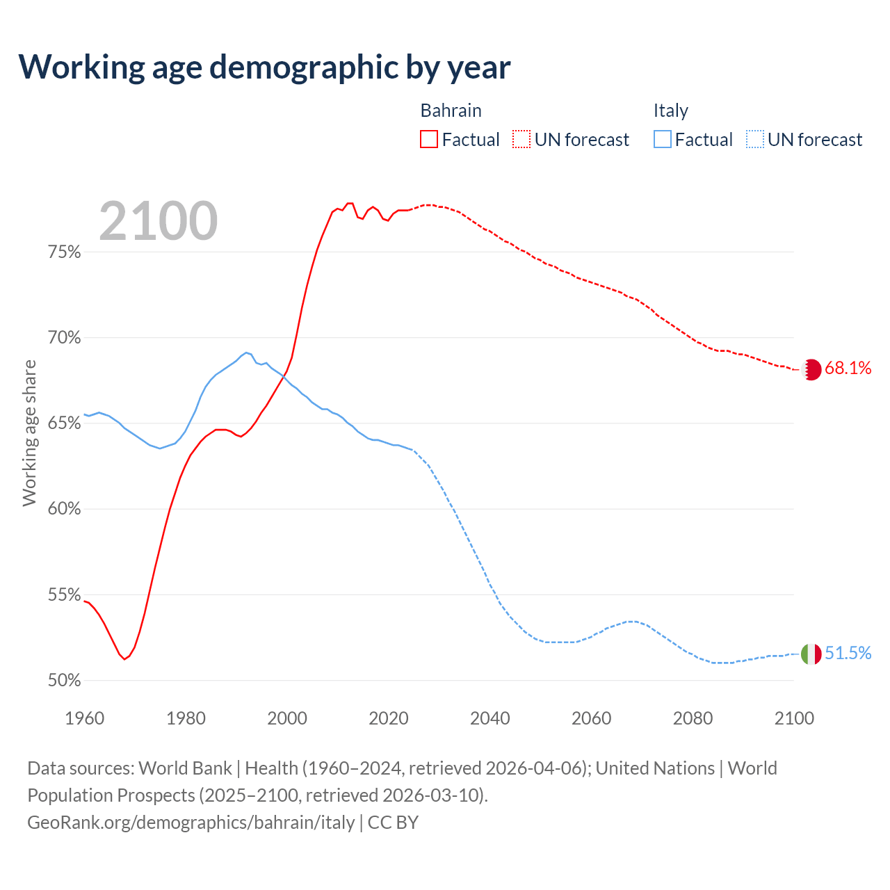 - Bahrain has 1.29M working age adults (aged 15-64) vs 37.2M in Italy.