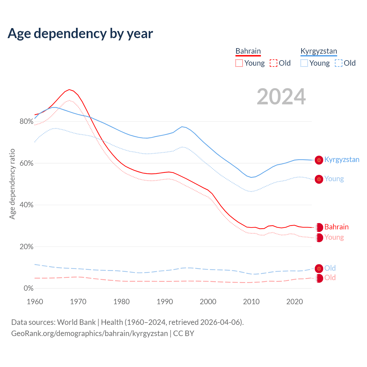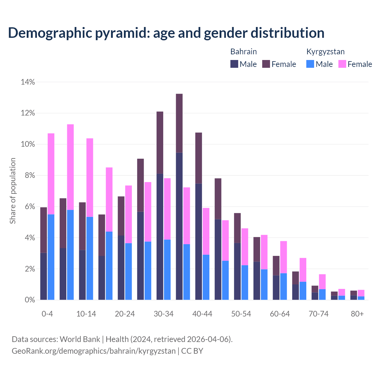- Bahrain is ranked 80/196 by median age (oldest to youngest) vs 126/196 for Kyrgyzstan.