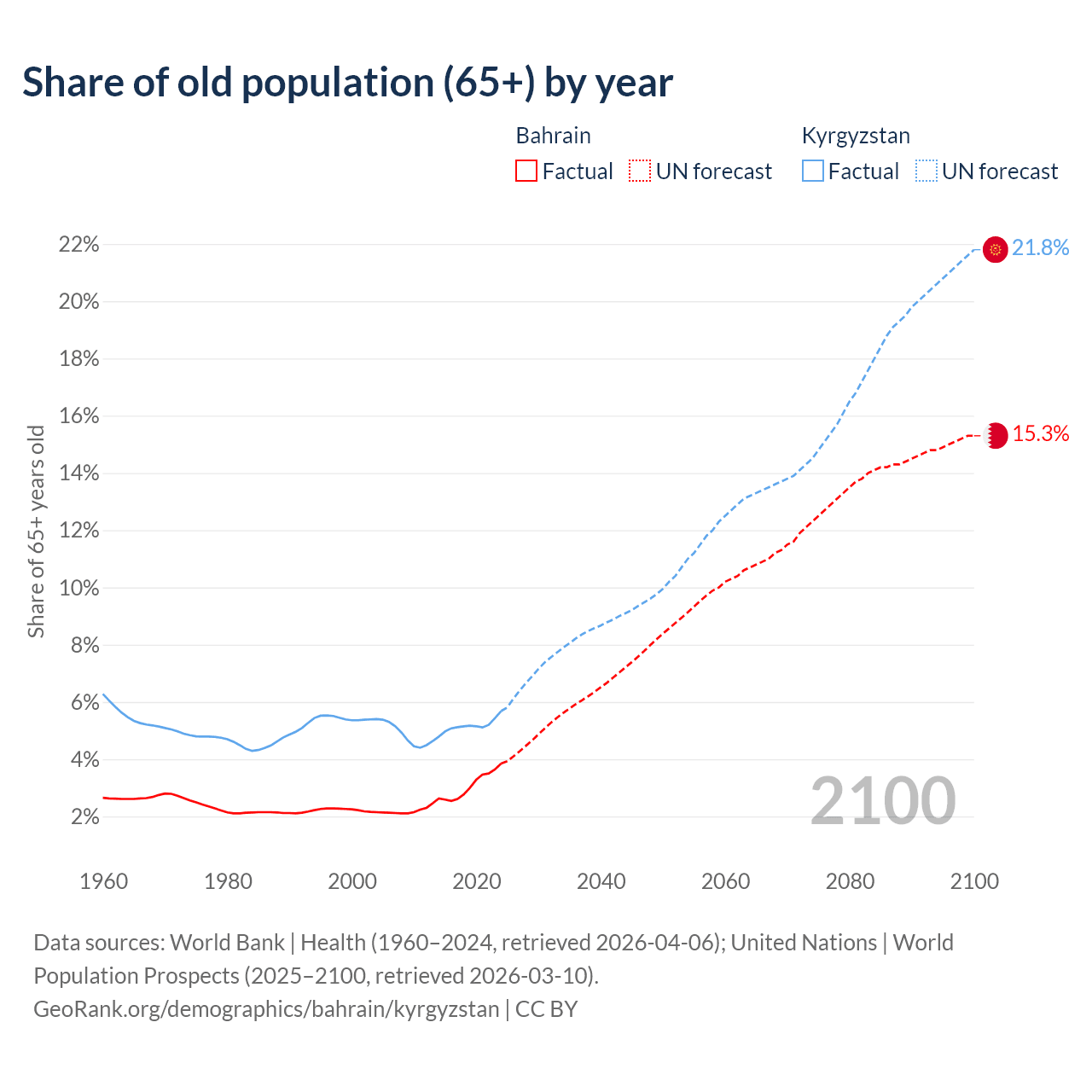- The share of old-age demographic (65+) in Bahrain is 3.85% vs 5.68% in Kyrgyzstan.