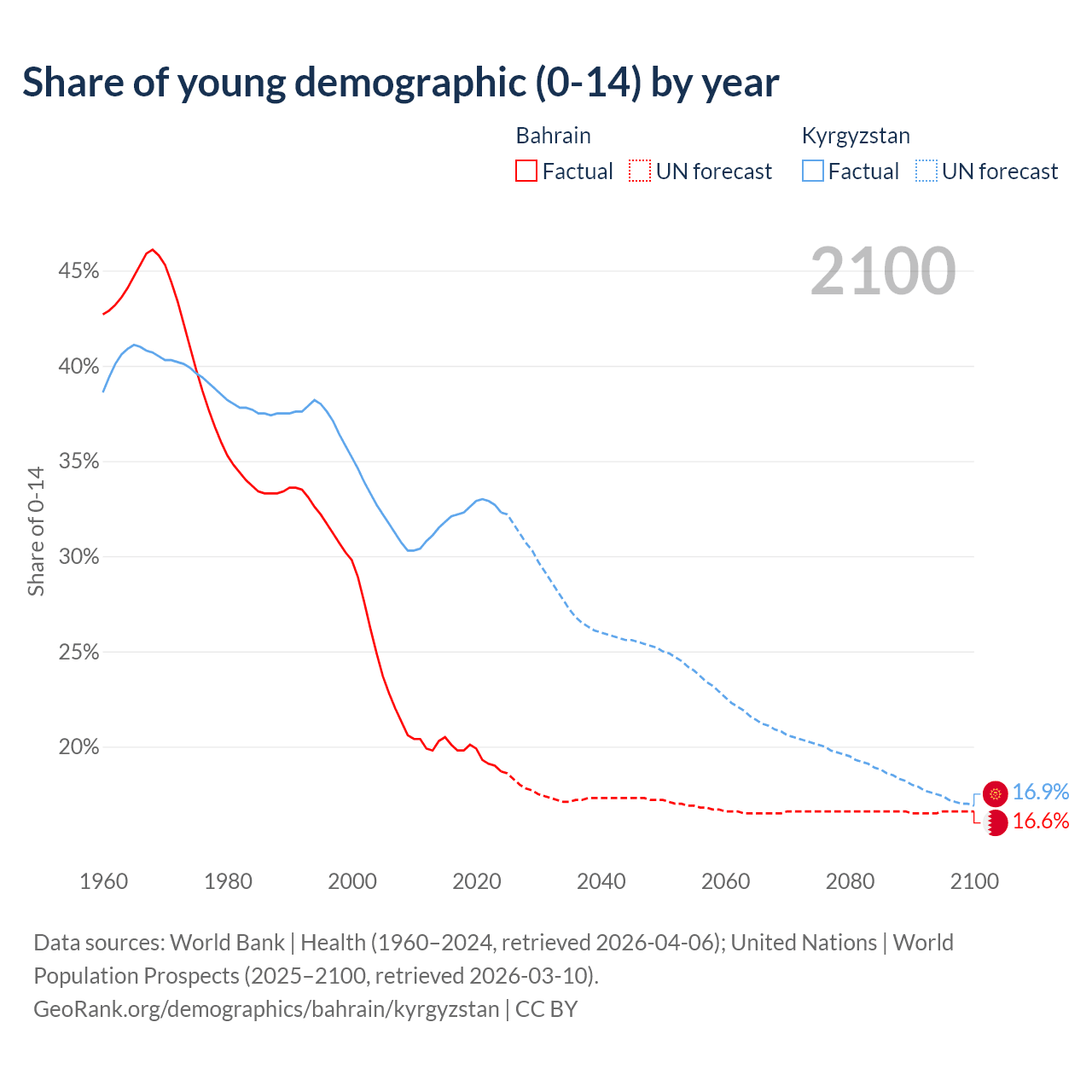 - The share of young demographic (0-15 years old) in Bahrain is 18.7% vs 32.3% in Kyrgyzstan.
