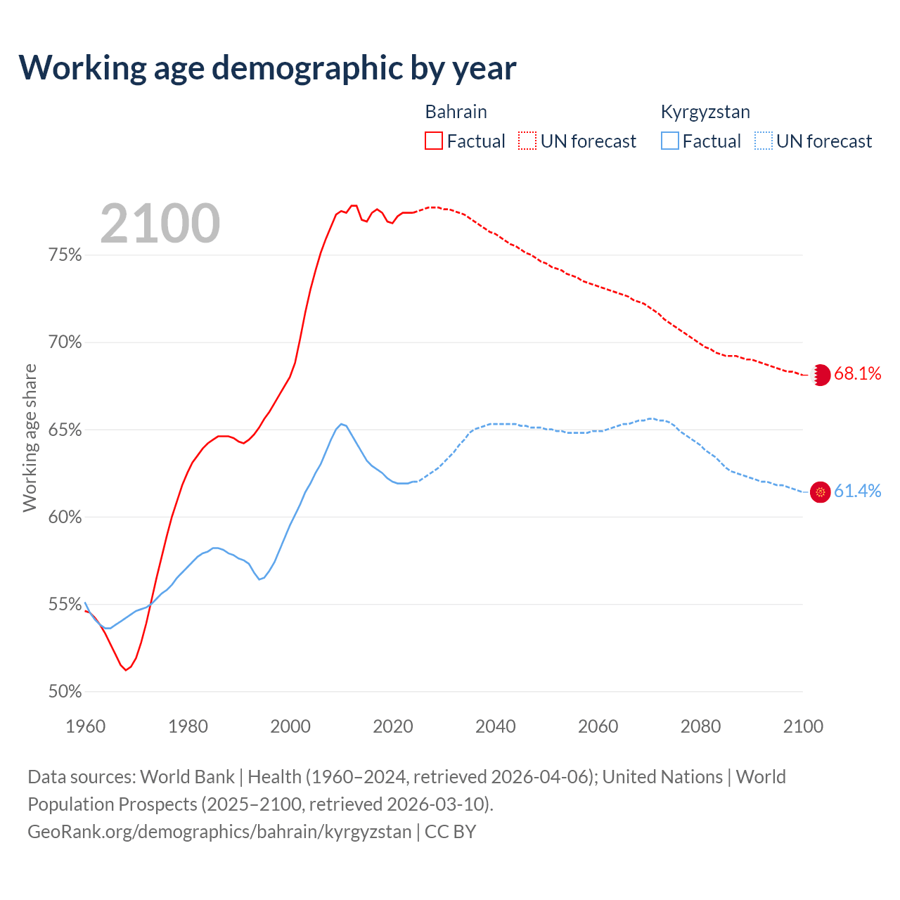 - Bahrain has 1.29M working age adults (aged 15-64) vs 4.63M in Kyrgyzstan.