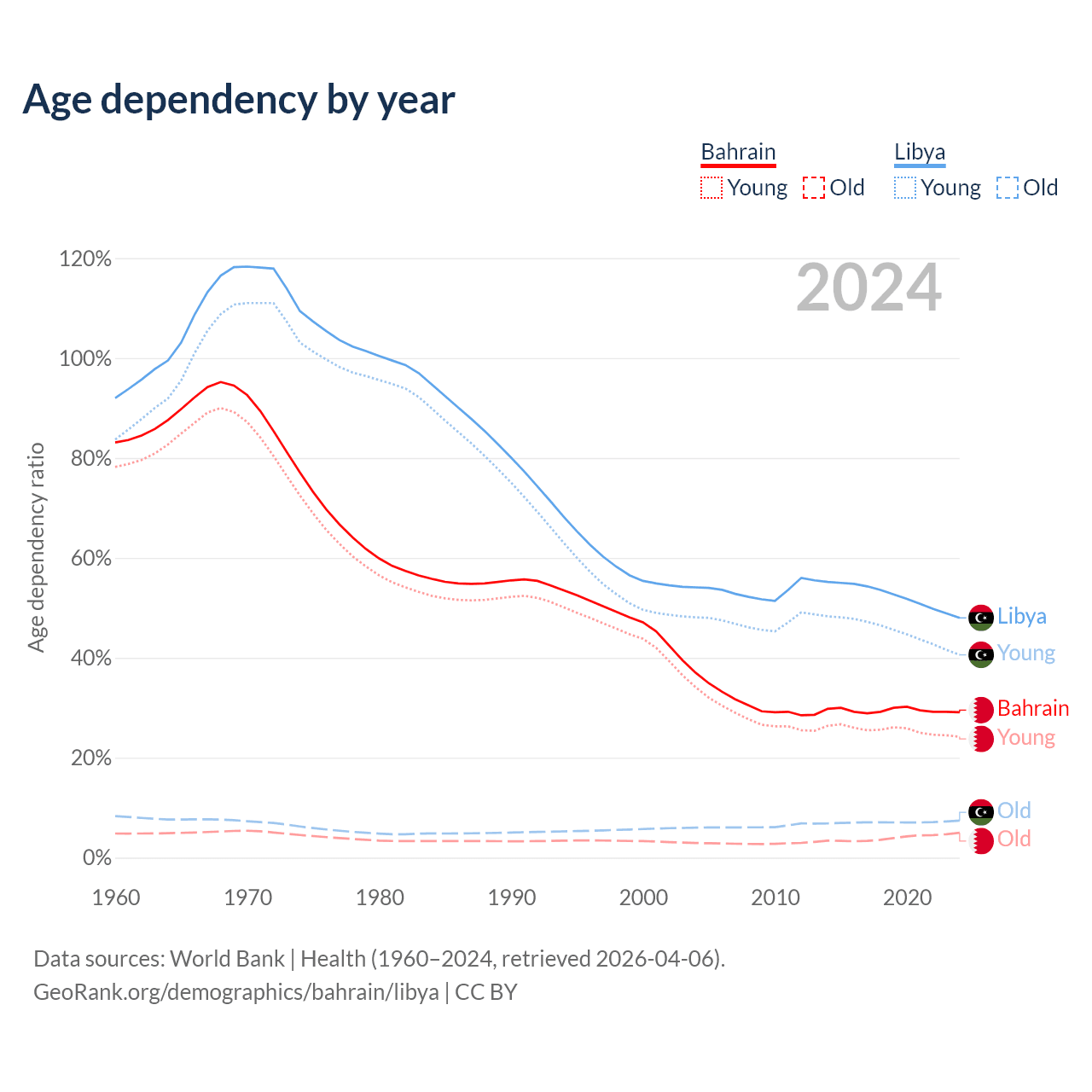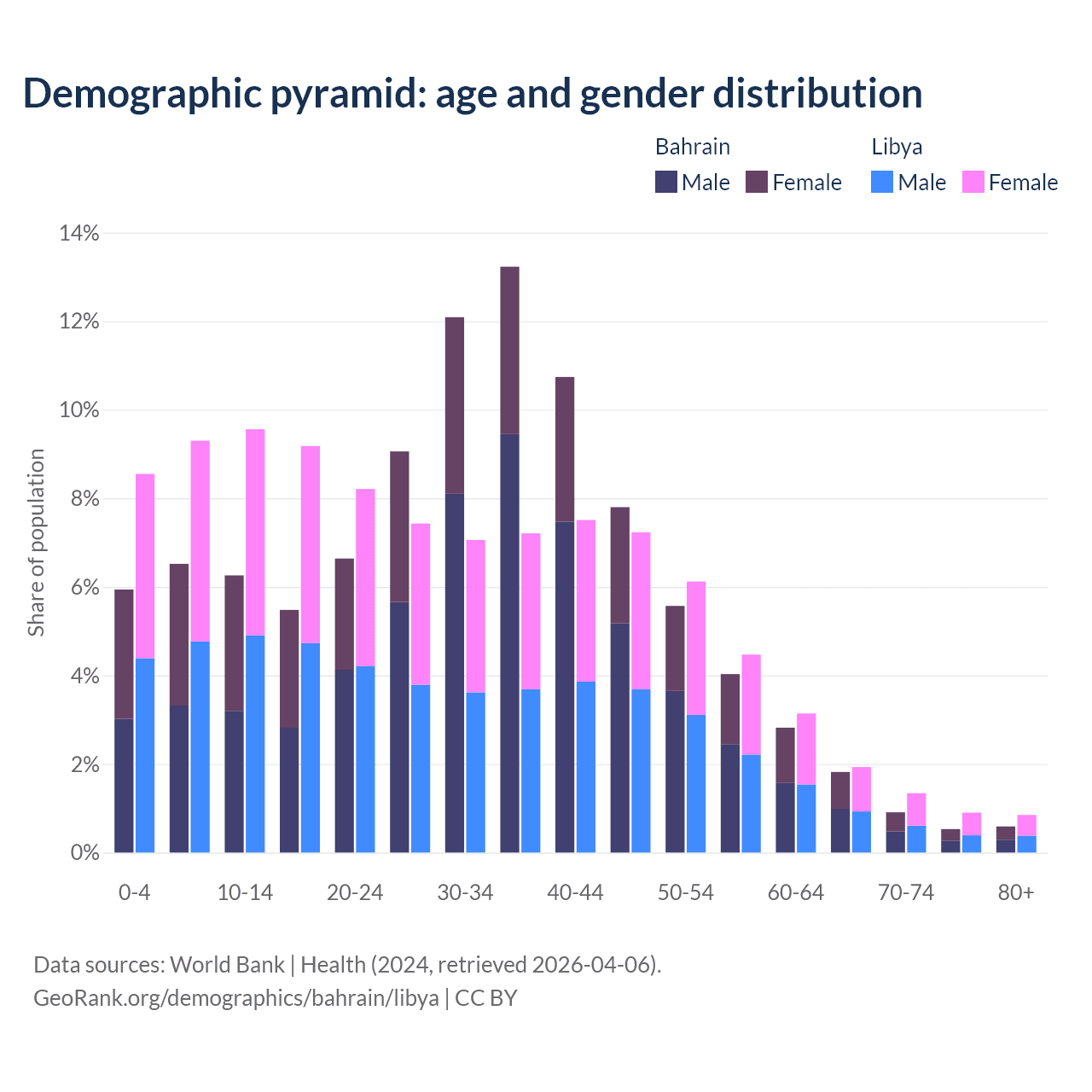 - Bahrain is ranked 80/196 by median age (oldest to youngest) vs 114/196 for Libya.