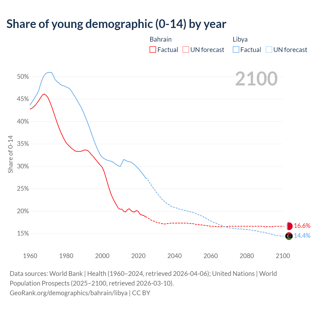 Median age Bahrain vs Libya, 1960-2100