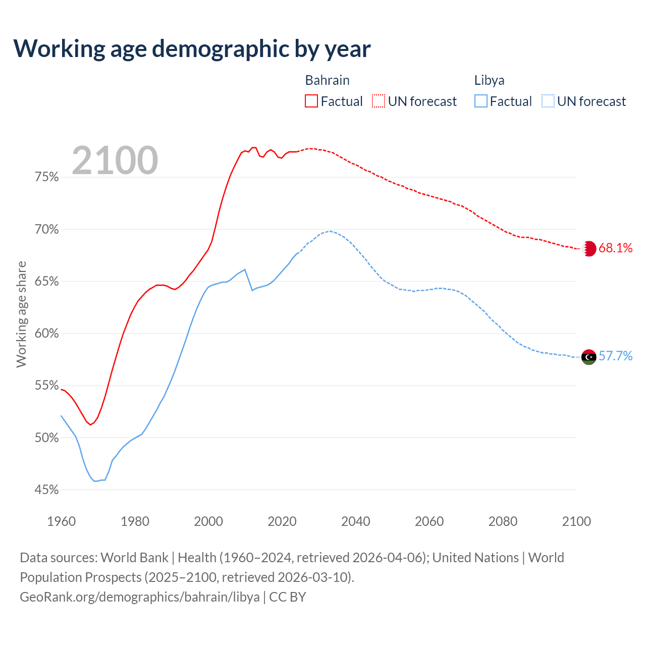 - Bahrain has 1.29M working age adults (aged 15-64) vs 5.11M in Libya.
