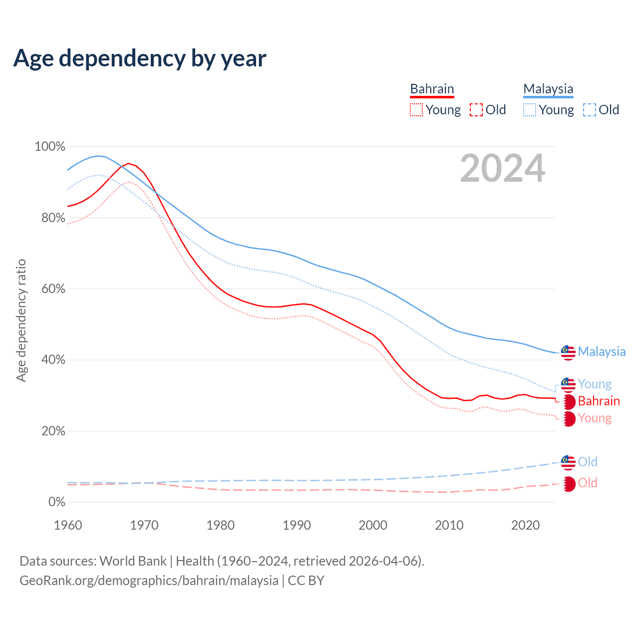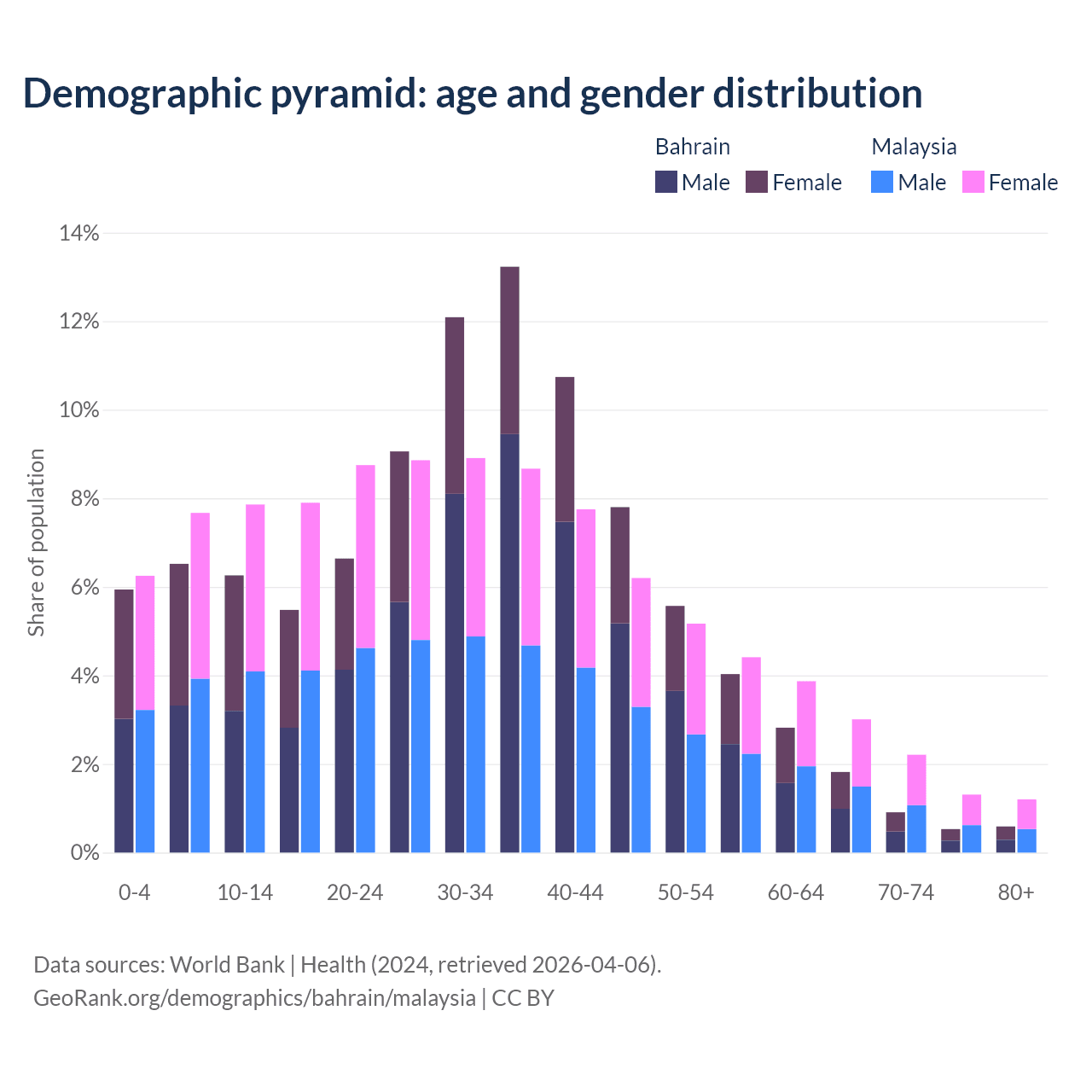 - Bahrain is ranked 80/196 by median age (oldest to youngest) vs 92/196 for Malaysia.