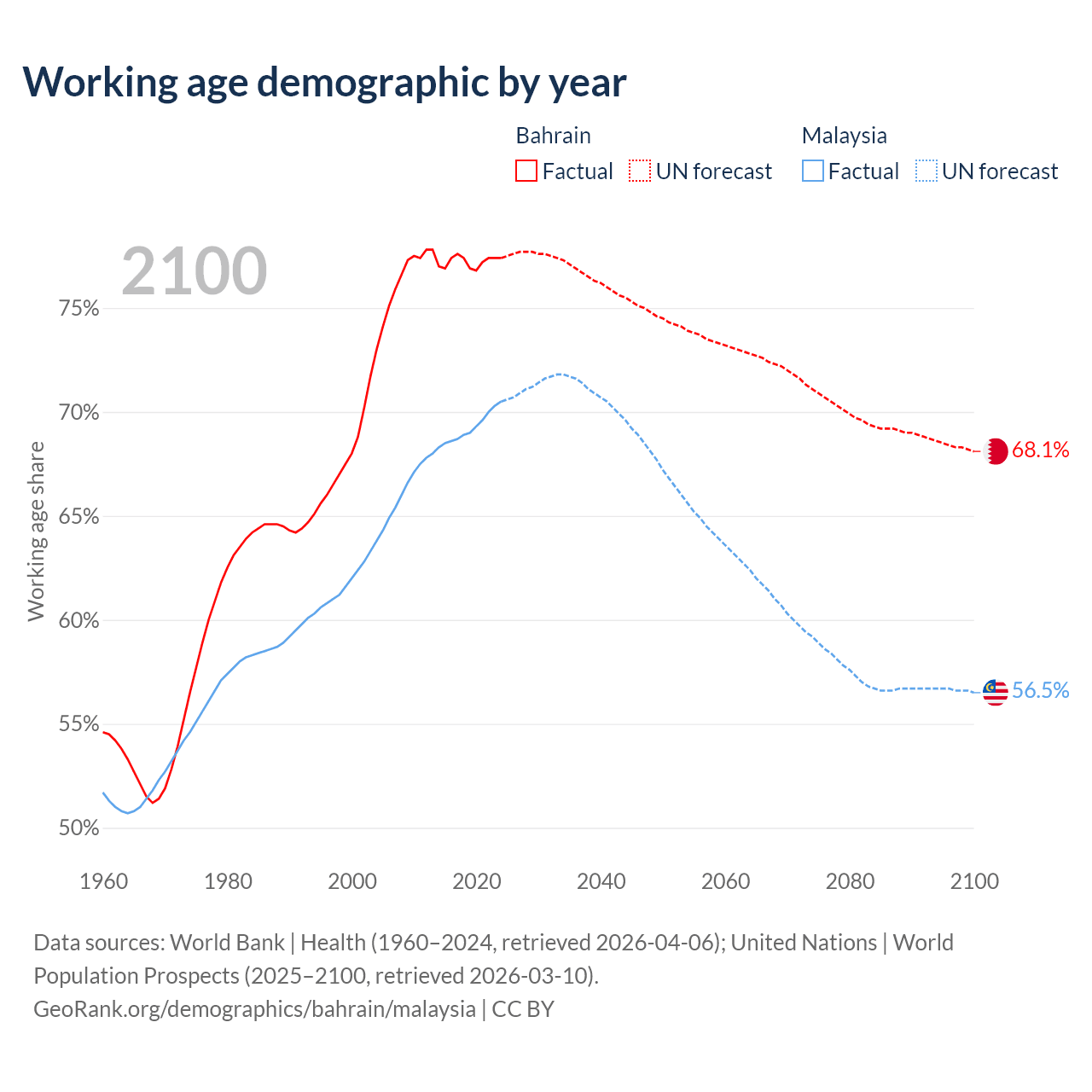 Median age Bahrain vs Malaysia, 1960-2100