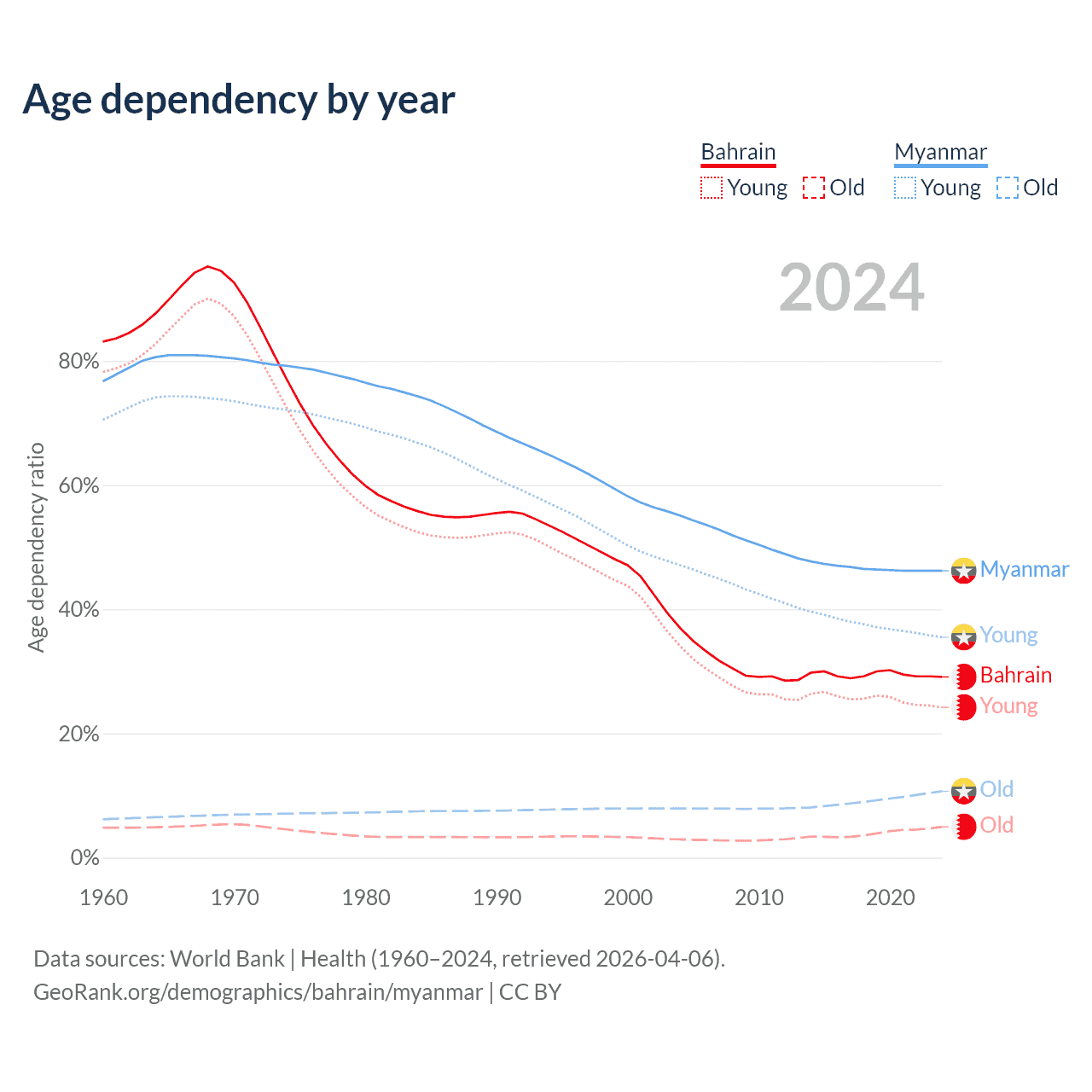 - Bahrain is ranked 80/196 by median age (oldest to youngest) vs 96/196 for Myanmar.