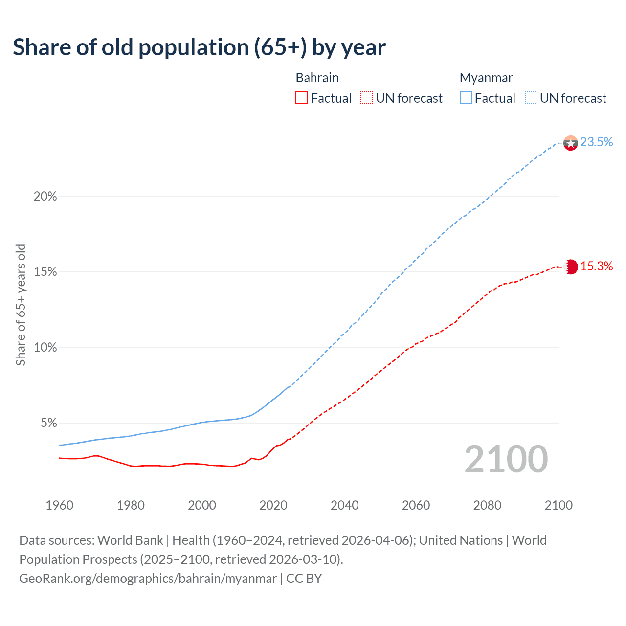 The share of older people aged 65 and over is 3.85% in Bahrain and 7.3% in Myanmar. Life expectancy in Bahrain compared to Myanmar .