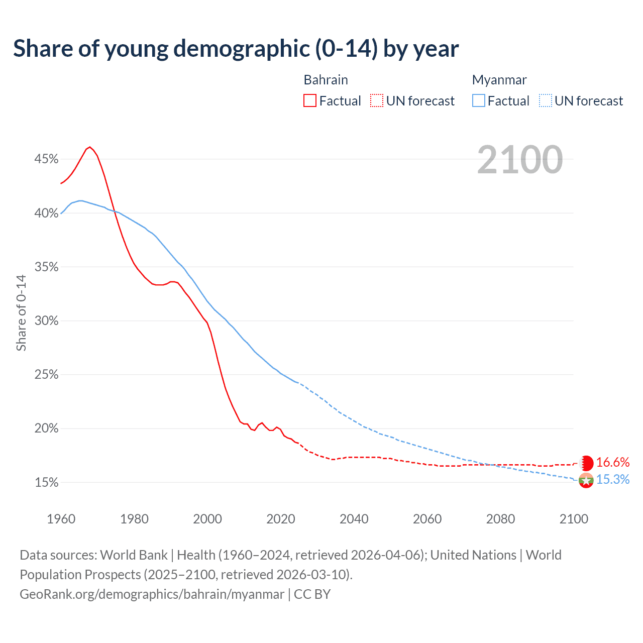 - The share of young demographic (0-15 years old) in Bahrain is 18.7% vs 24.3% in Myanmar.