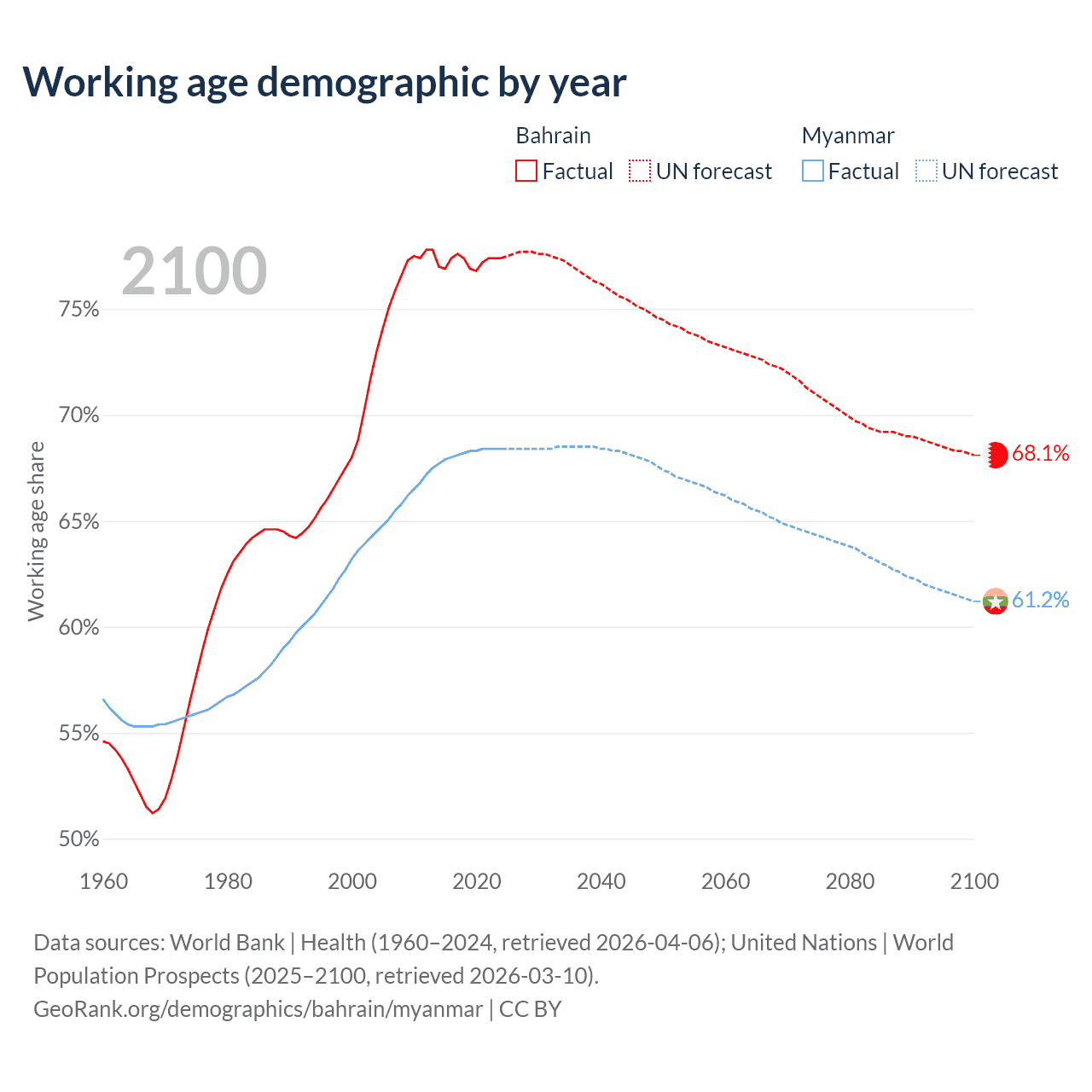 Median age Bahrain vs Myanmar, 1960-2100