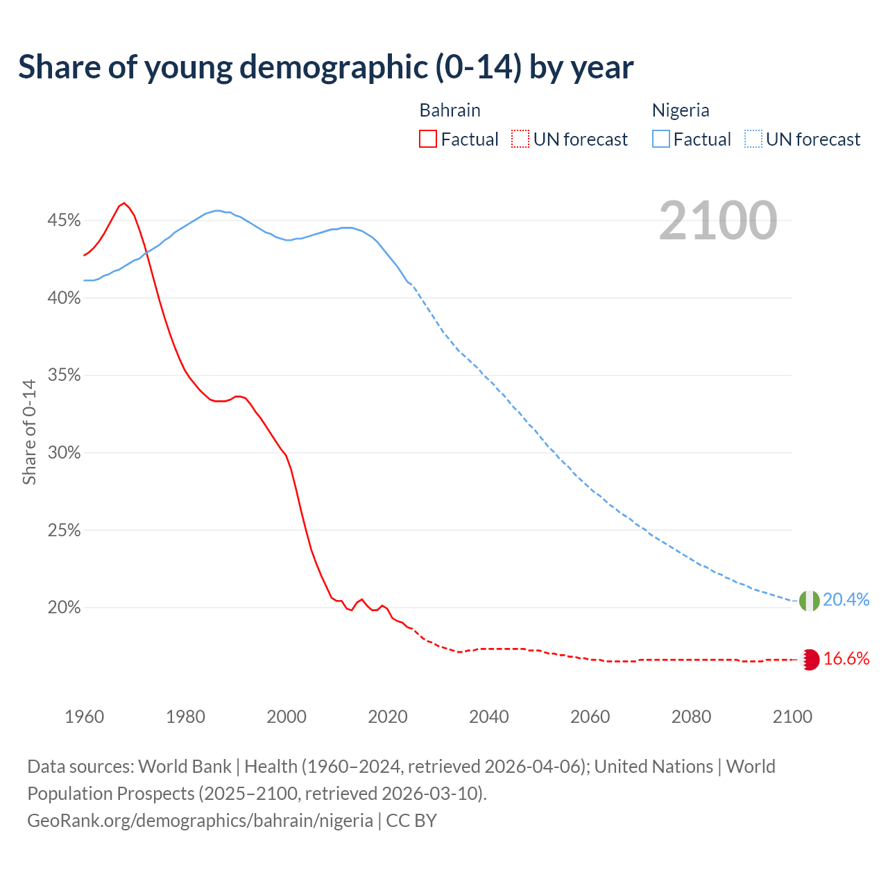 Median age Bahrain vs Nigeria, 1960-2100