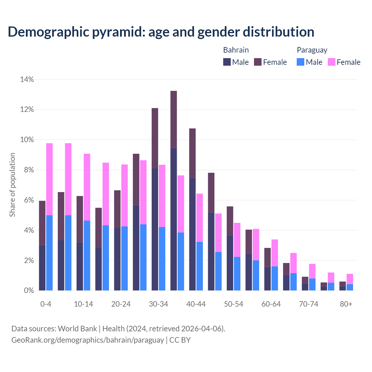 - Bahrain is ranked 80/196 by median age (oldest to youngest) vs 118/196 for Paraguay.