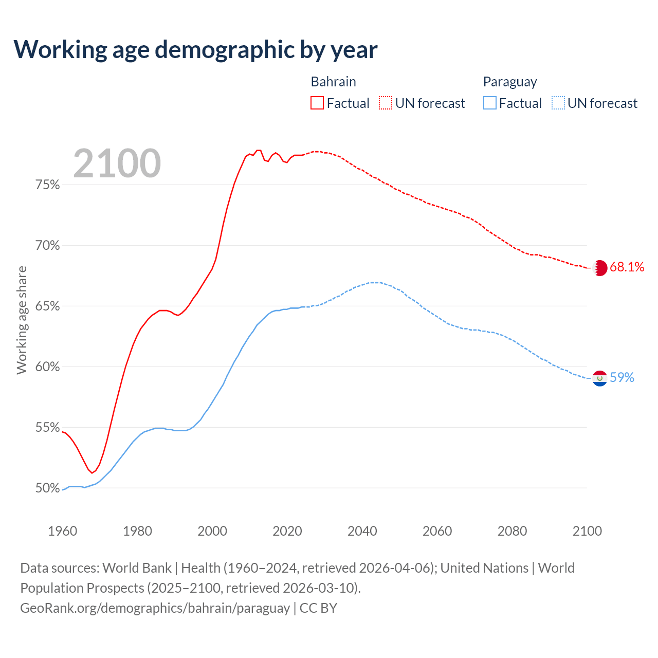 - Bahrain has 1.29M working age adults (aged 15-64) vs 4.62M in Paraguay.