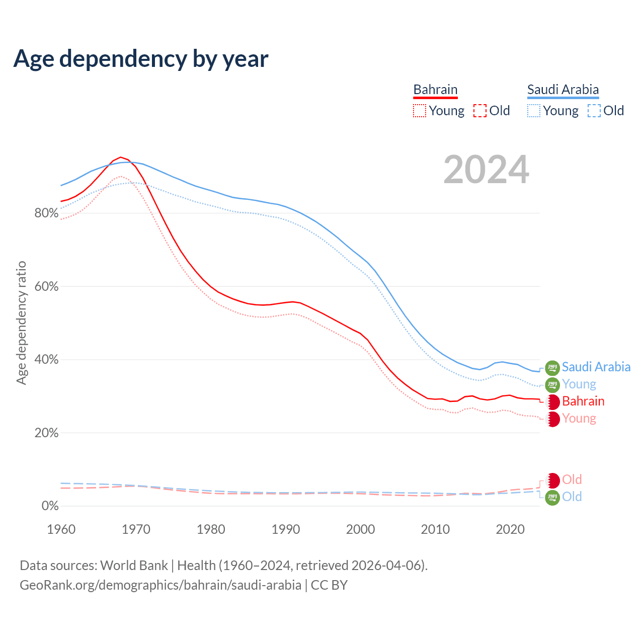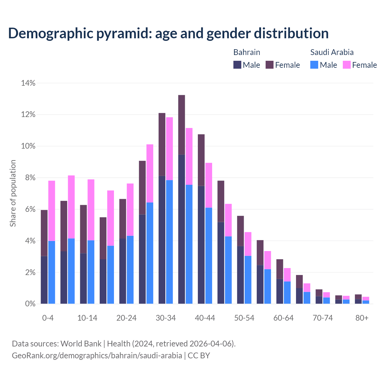 - Bahrain is ranked 80/196 by median age (oldest to youngest) vs 98/196 for Saudi Arabia.