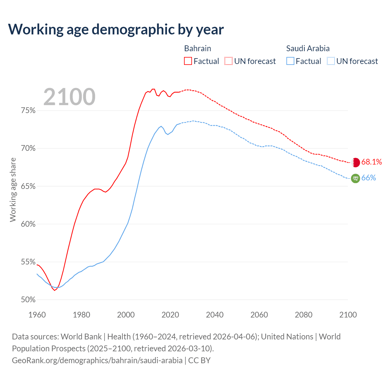 Median age Bahrain vs Saudi Arabia, 1960-2100