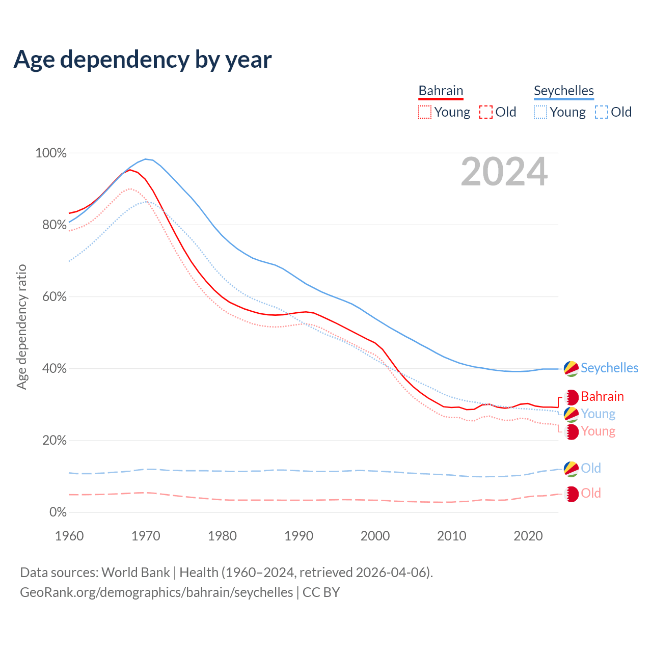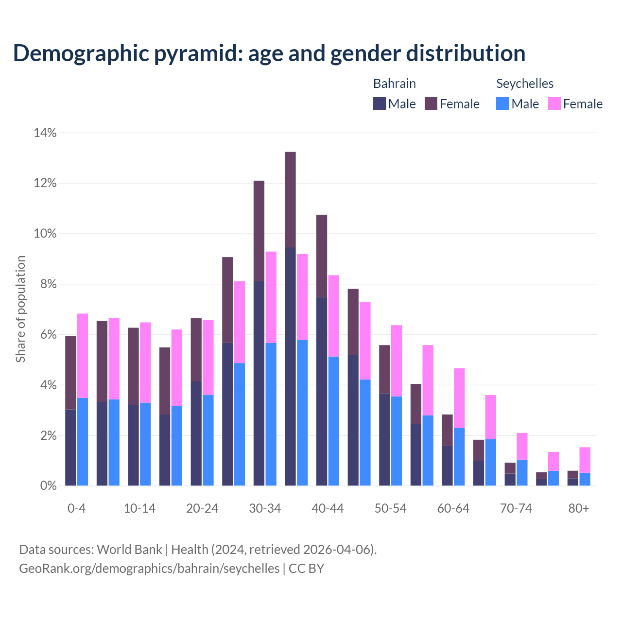 - Bahrain is ranked 80/196 by median age (oldest to youngest) vs 76/196 for the Seychelles.