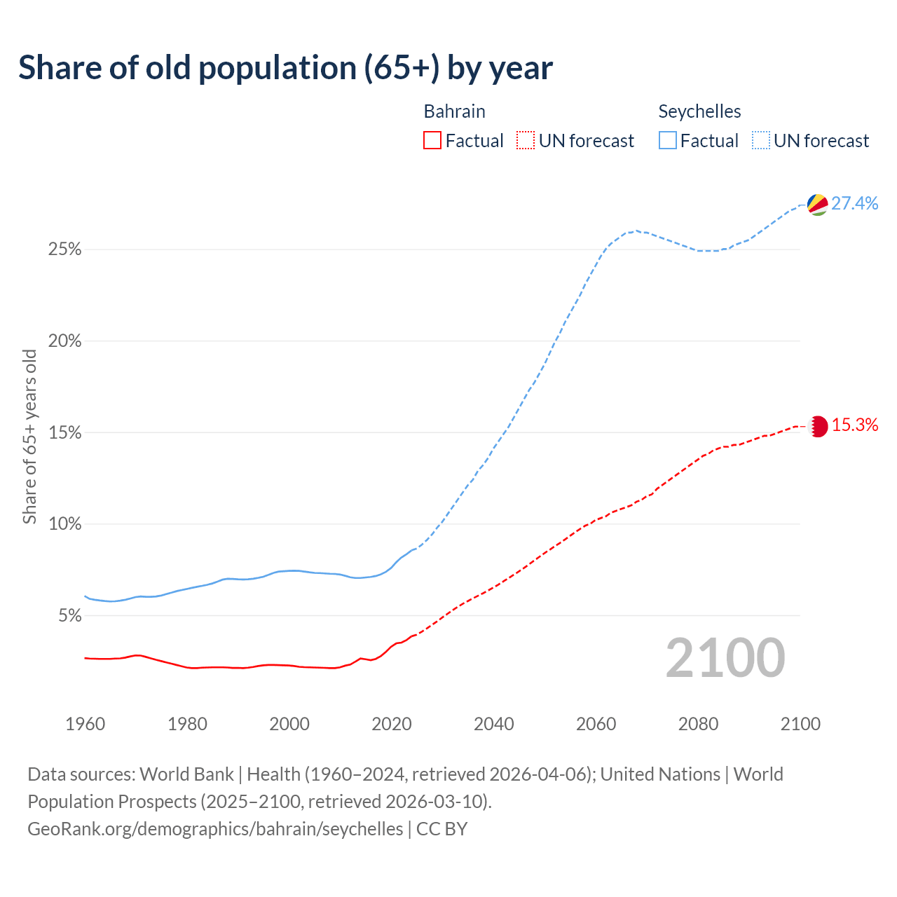 - The share of old-age demographic (65+) in Bahrain is 3.85% vs 8.54% in the Seychelles.