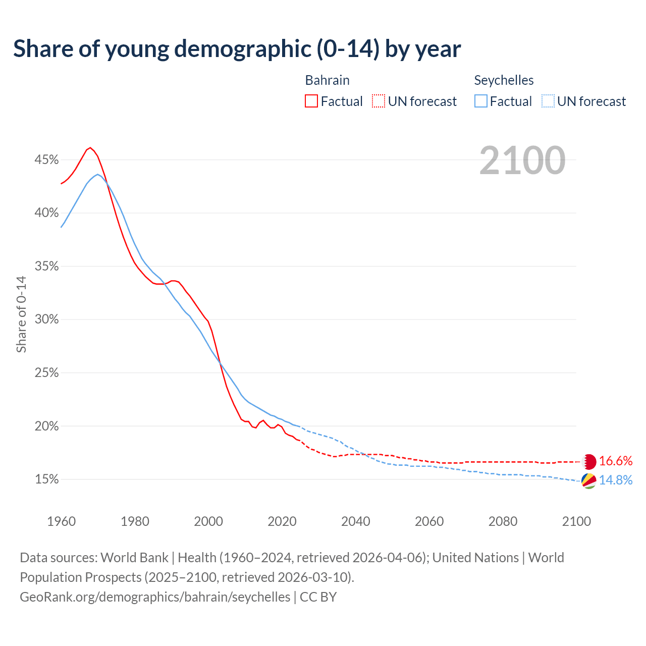 - The share of young demographic (0-15 years old) in Bahrain is 18.7% vs 20% in the Seychelles.