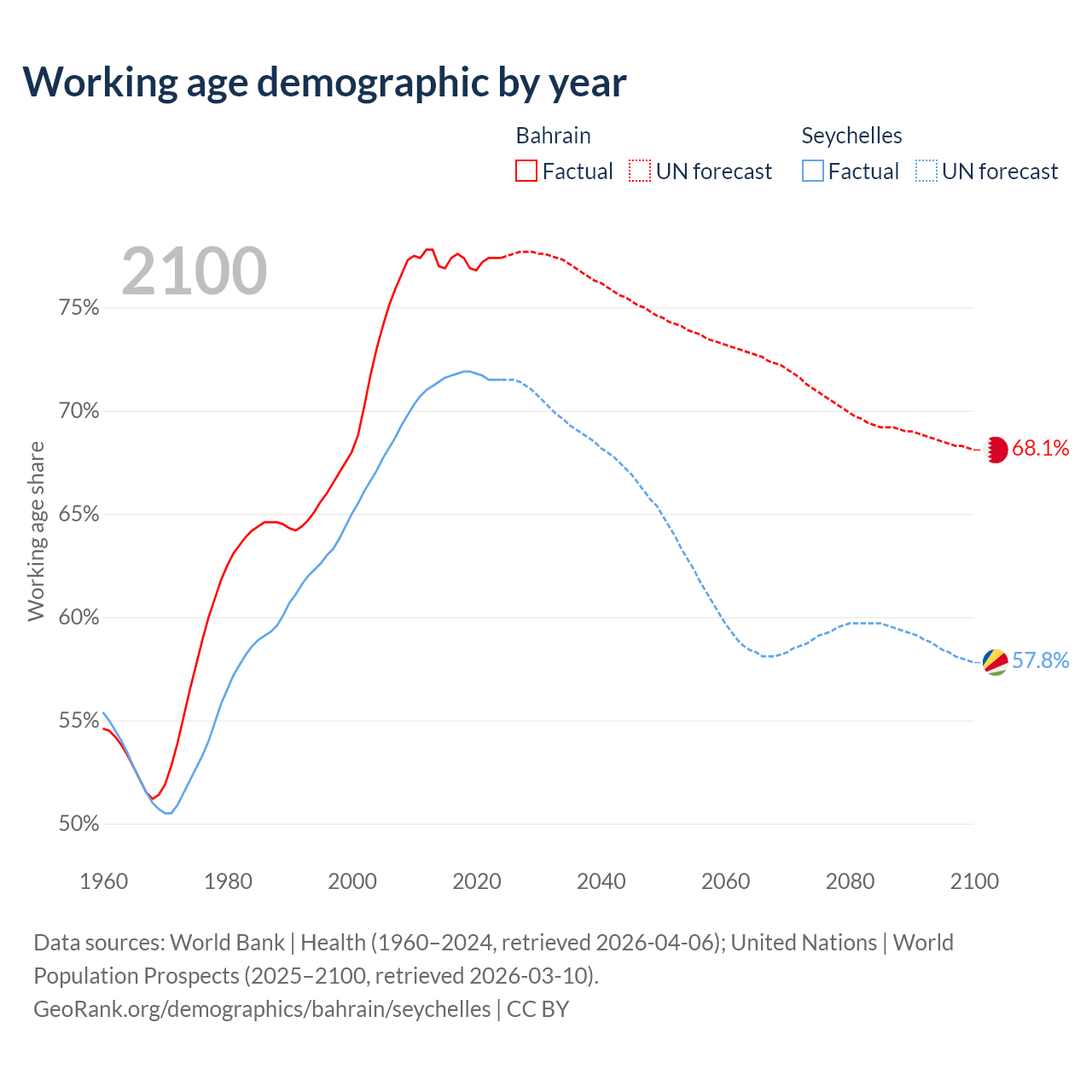 - Bahrain has 1.29M working age adults (aged 15-64) vs 90.3K in the Seychelles.