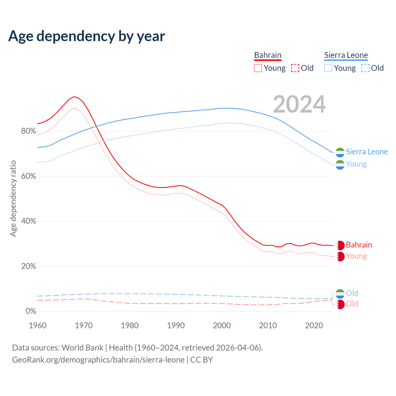 - The share of old-age demographic (65+) in Bahrain is 3.85% vs 3.24% in Sierra Leone.