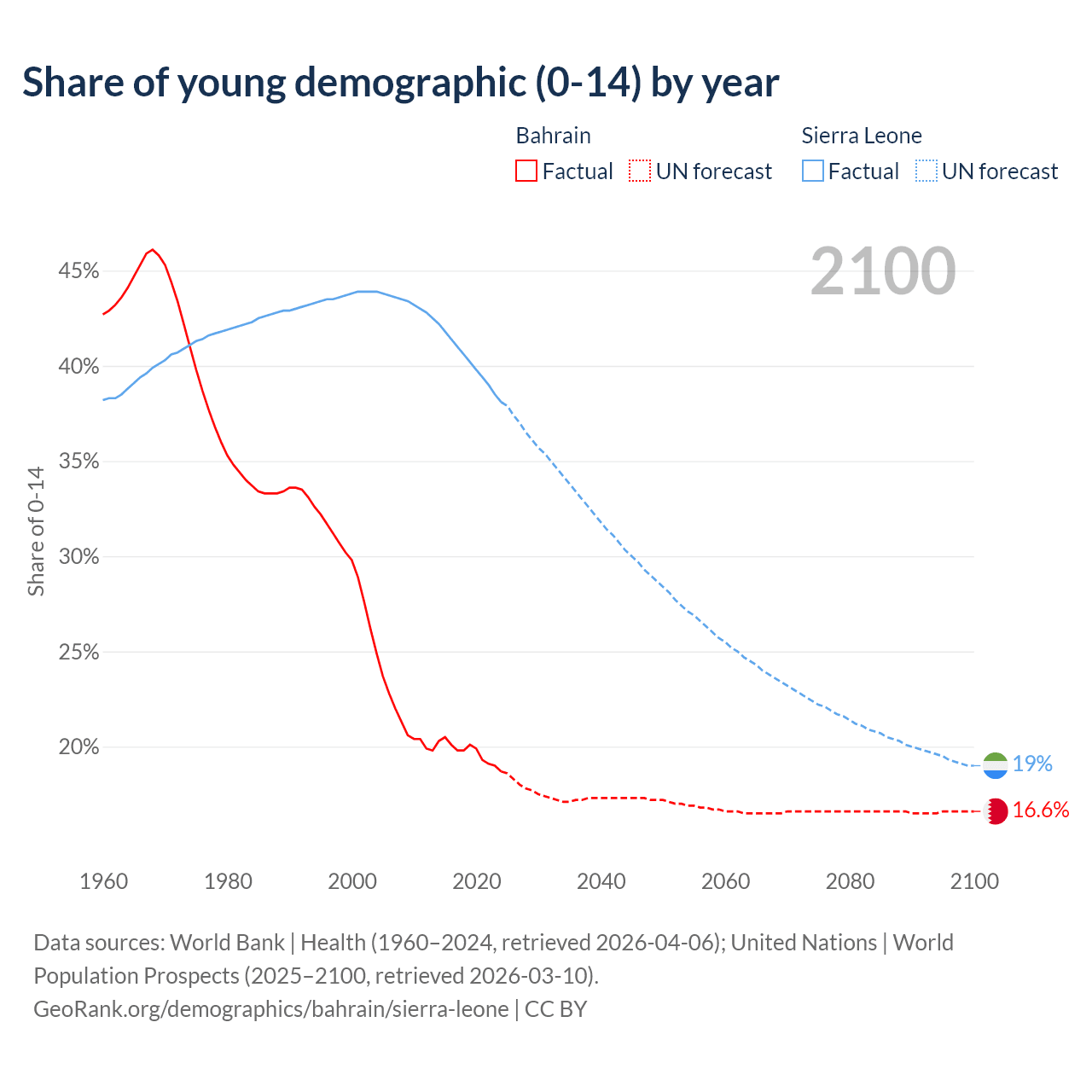 Median age Bahrain vs Sierra Leone, 1960-2100