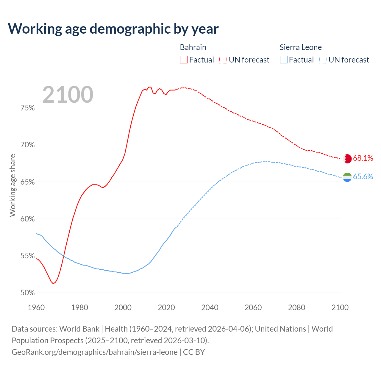 - Bahrain has 1.29M working age adults (aged 15-64) vs 5.31M in Sierra Leone.