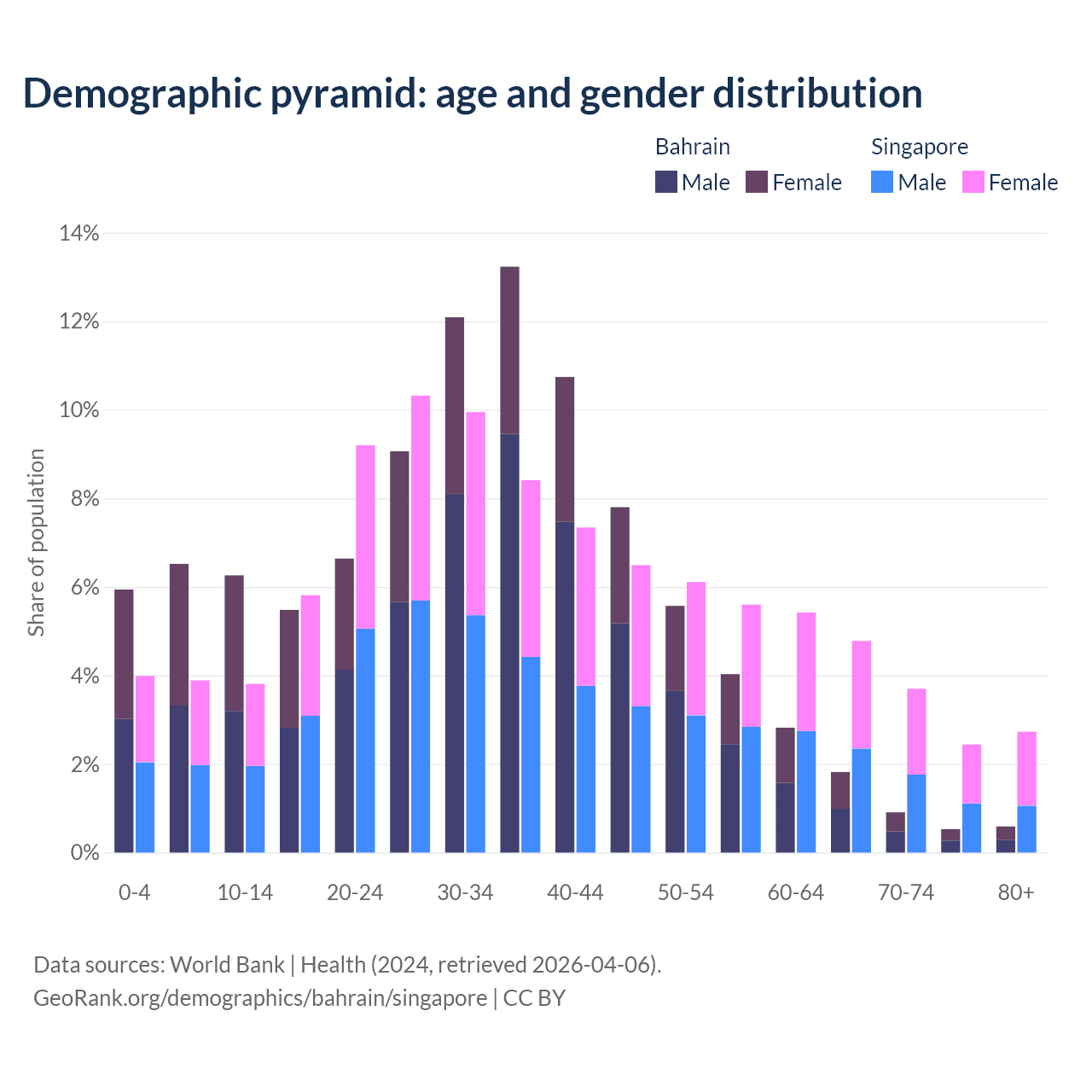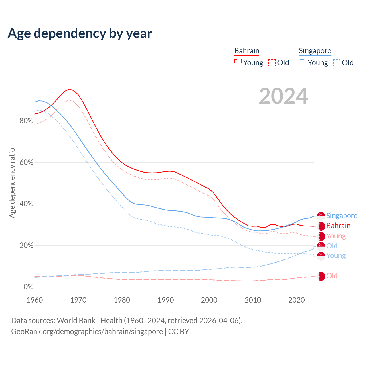 - Bahrain is ranked 80/196 by median age (oldest to youngest) vs 68/196 for Singapore.
