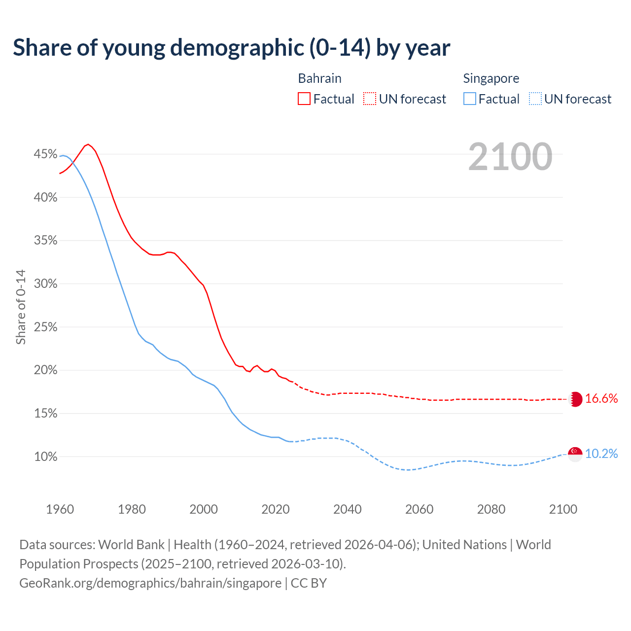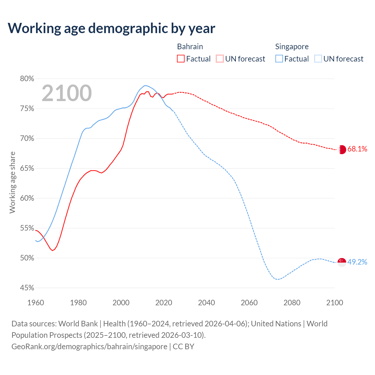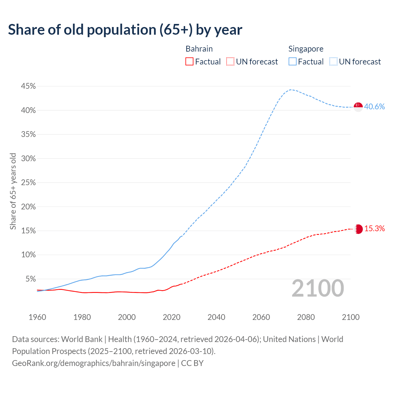 Median age Bahrain vs Singapore, 1960-2100