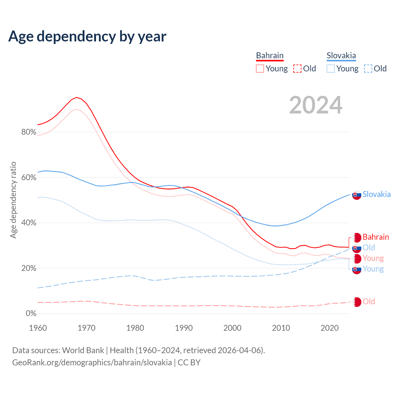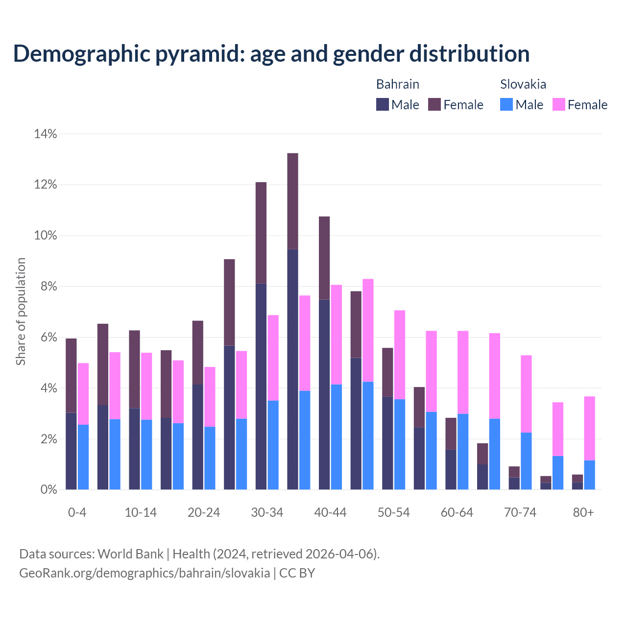 - Bahrain is ranked 80/196 by median age (oldest to youngest) vs 31/196 for Slovakia.