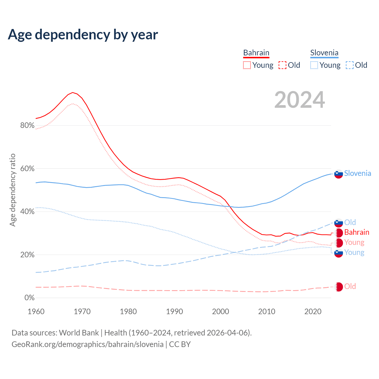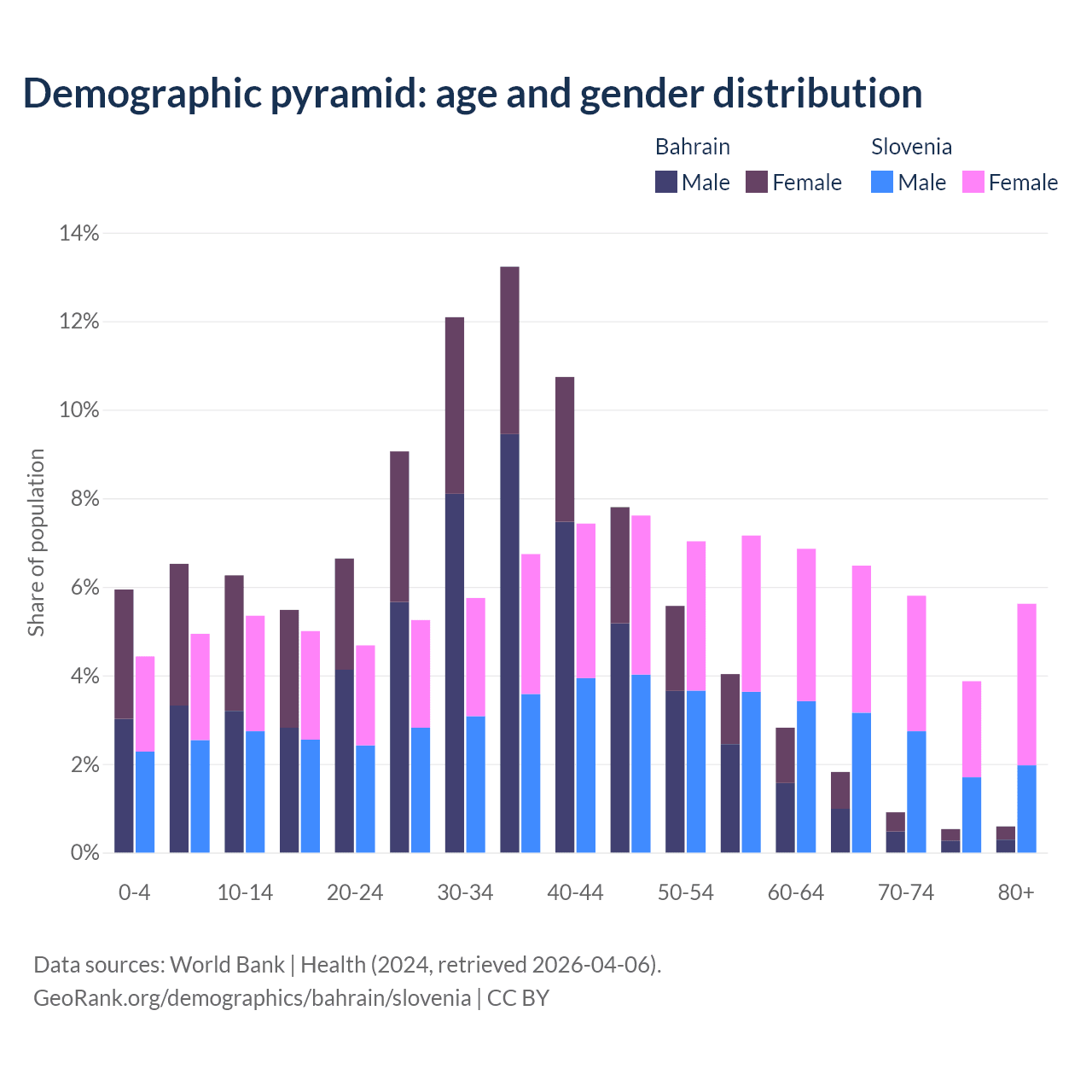 - Bahrain is ranked 80/196 by median age (oldest to youngest) vs 14/196 for Slovenia.