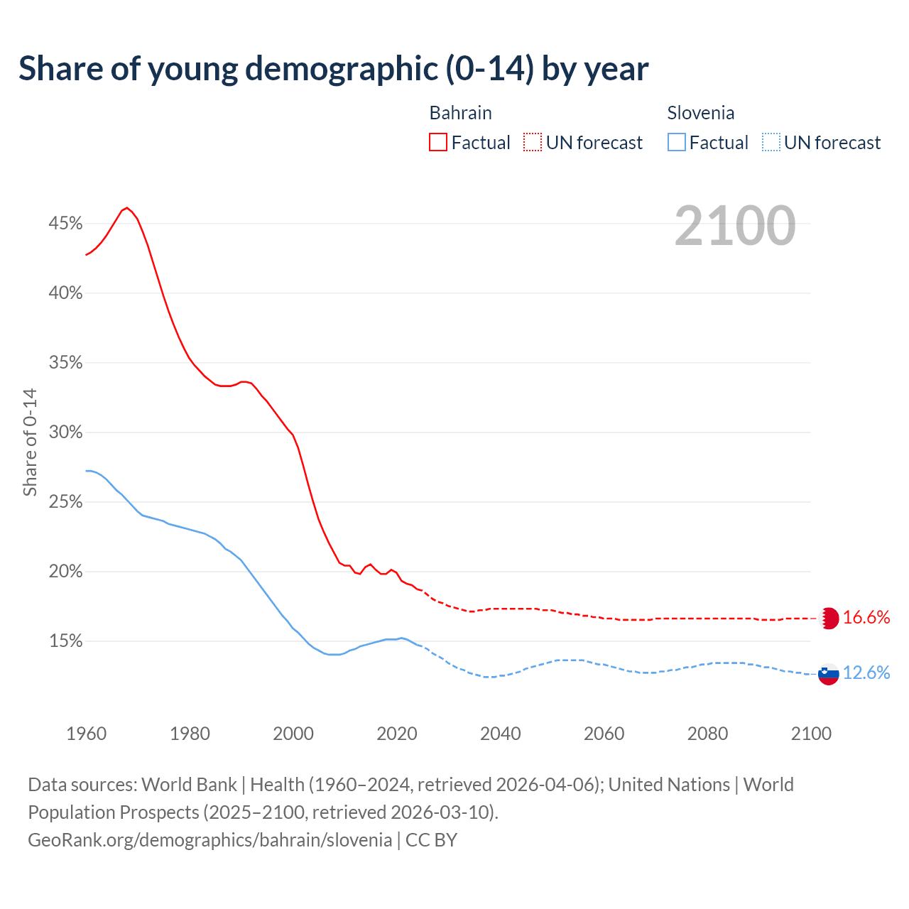 - The share of young demographic (0-15 years old) in Bahrain is 18.7% vs 14.7% in Slovenia.