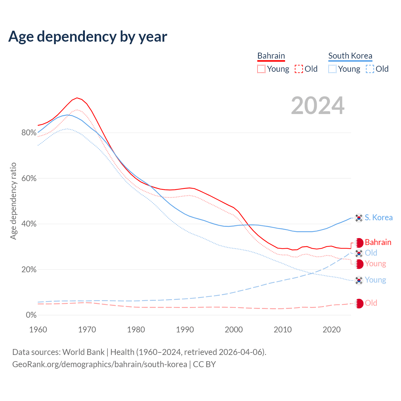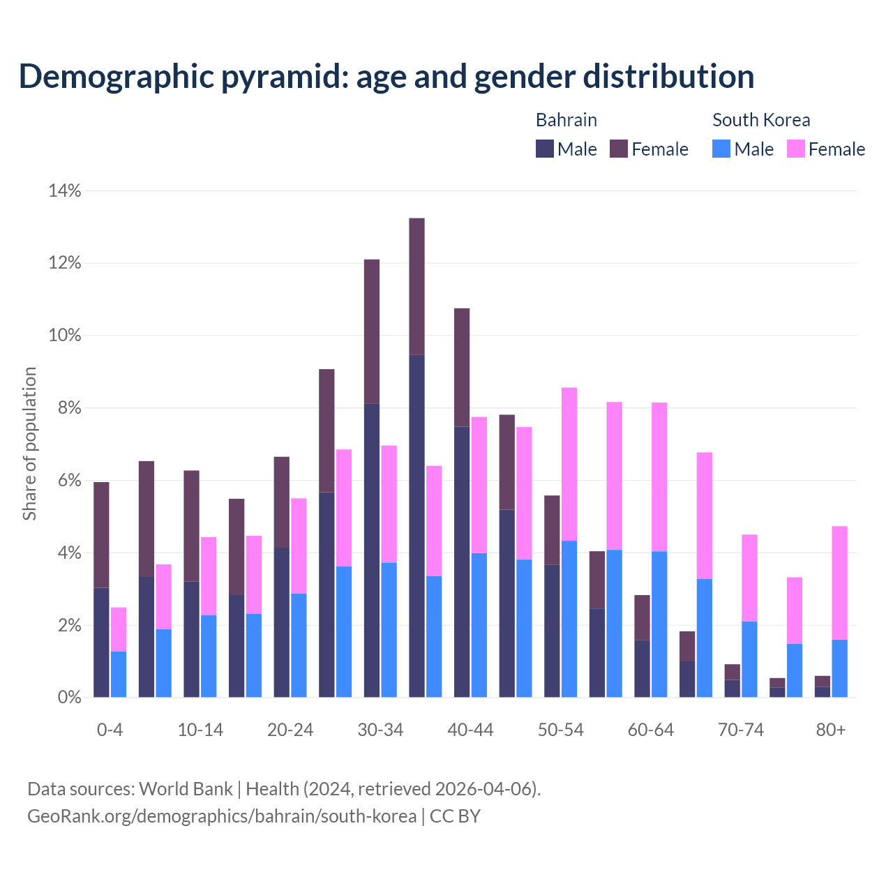 - Bahrain is ranked 80/196 by median age (oldest to youngest) vs 10/196 for South Korea.