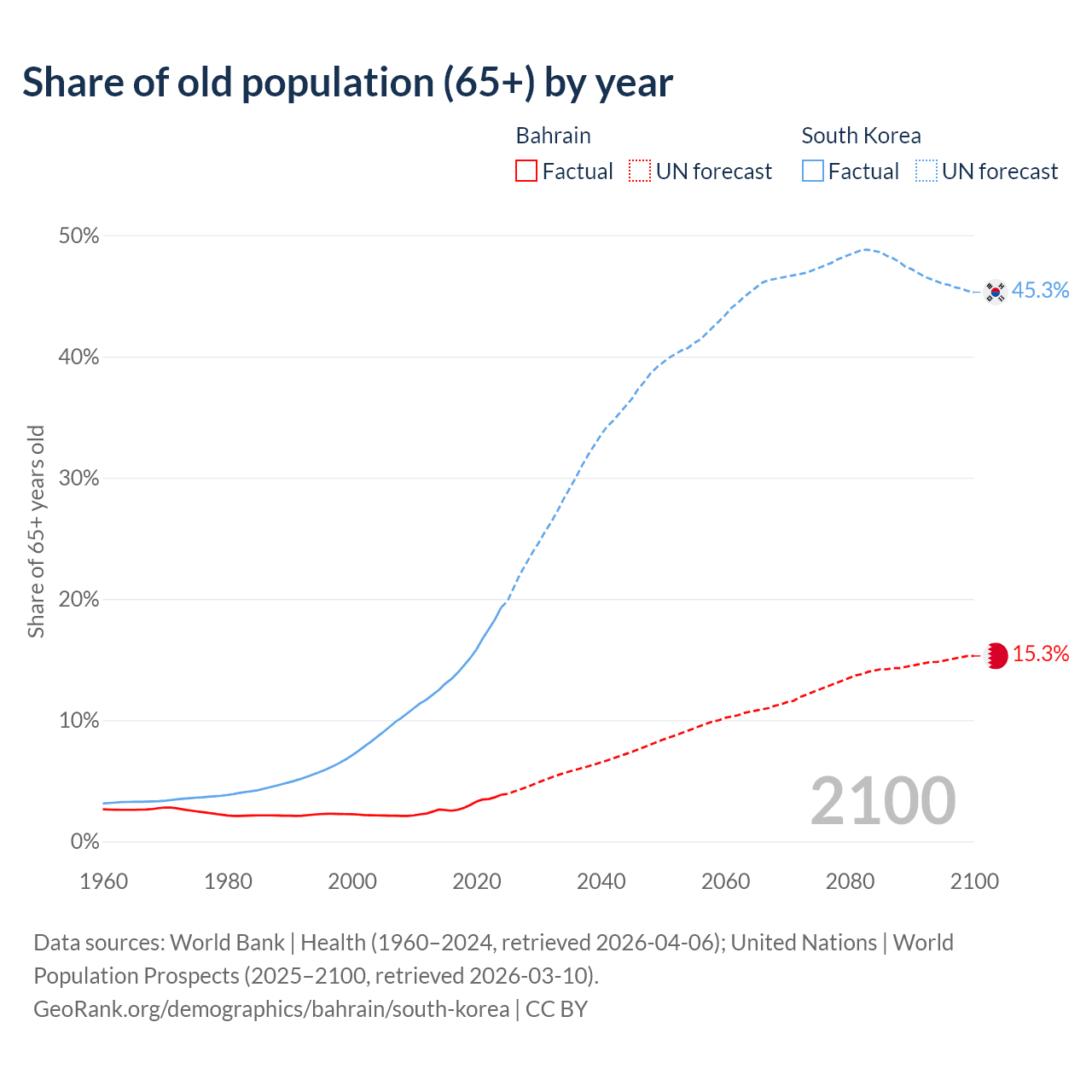 The share of older people aged 65 and over is 3.85% in Bahrain and 19.3% in South Korea. Life expectancy in Bahrain compared to South Korea .
