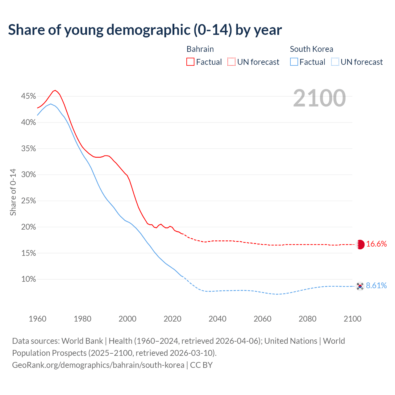 - The share of young demographic (0-15 years old) in Bahrain is 18.7% vs 10.6% in South Korea.