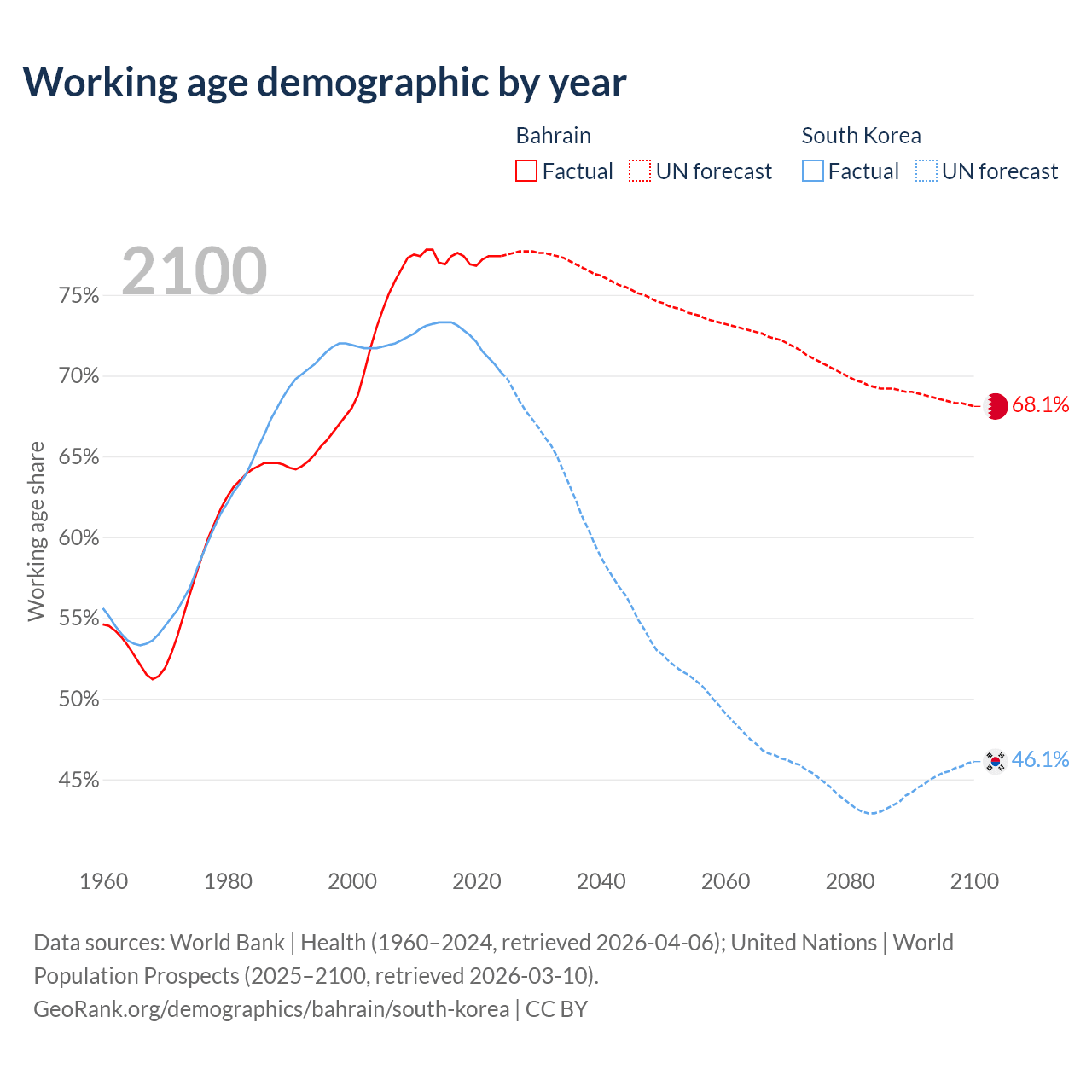 Median age Bahrain vs South Korea, 1960-2100