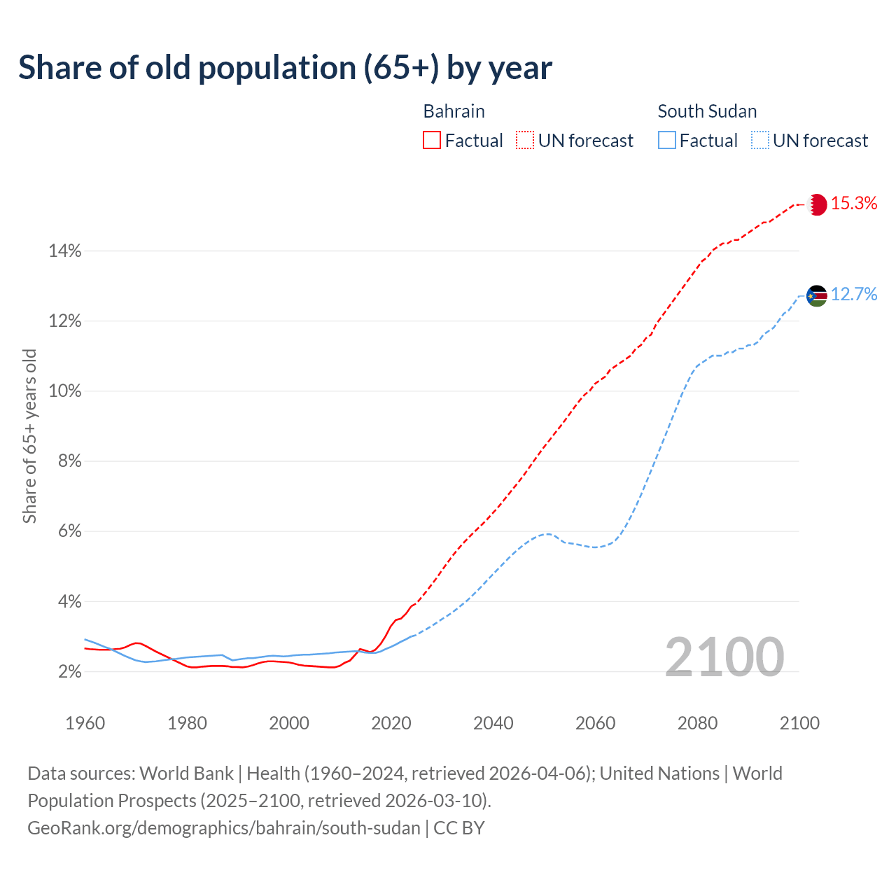The share of older people aged 65 and over is 3.85% in Bahrain and 2.99% in South Sudan. Life expectancy in Bahrain compared to South Sudan .