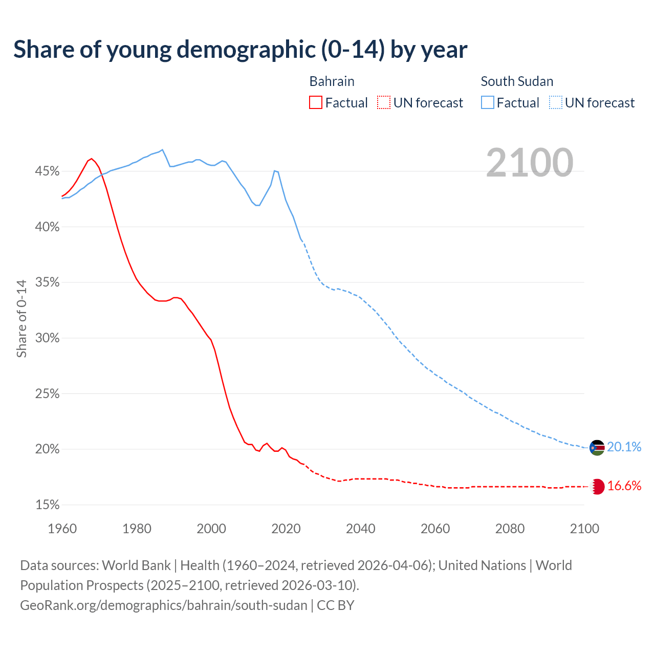 - The share of young demographic (0-15 years old) in Bahrain is 18.7% vs 38.9% in South Sudan.