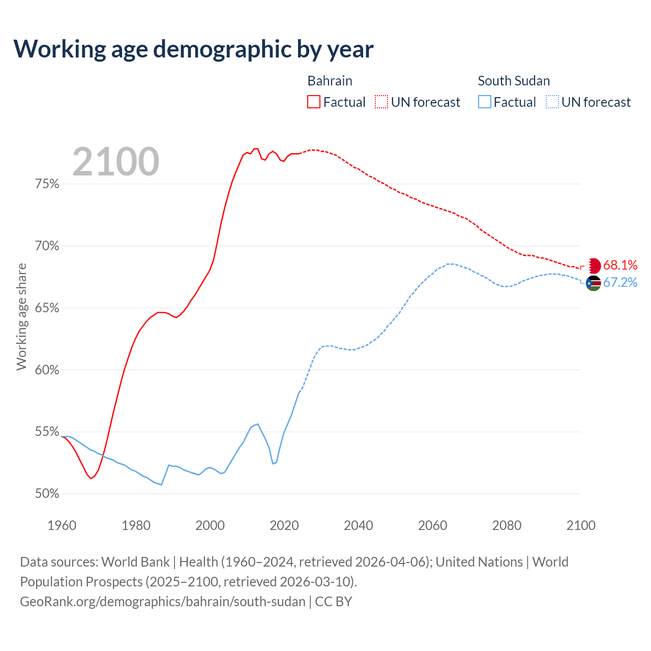 - Bahrain has 1.29M working age adults (aged 15-64) vs 7.27M in South Sudan.