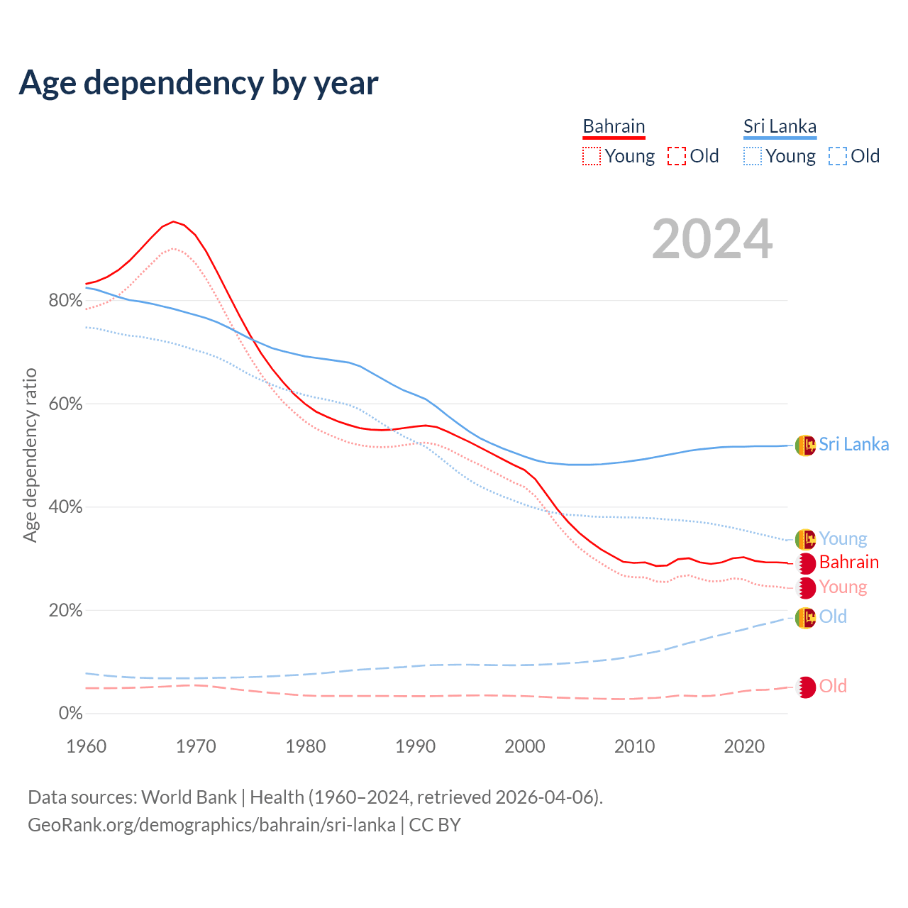 - Bahrain is ranked 80/196 by median age (oldest to youngest) vs 81/196 for Sri Lanka.
