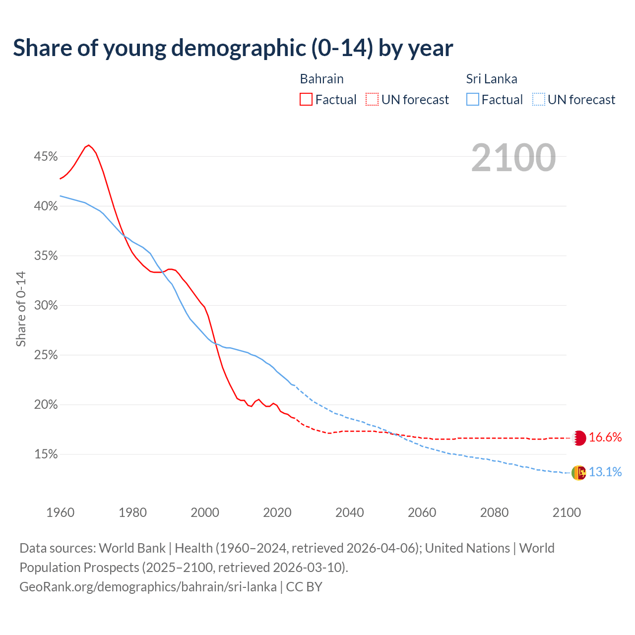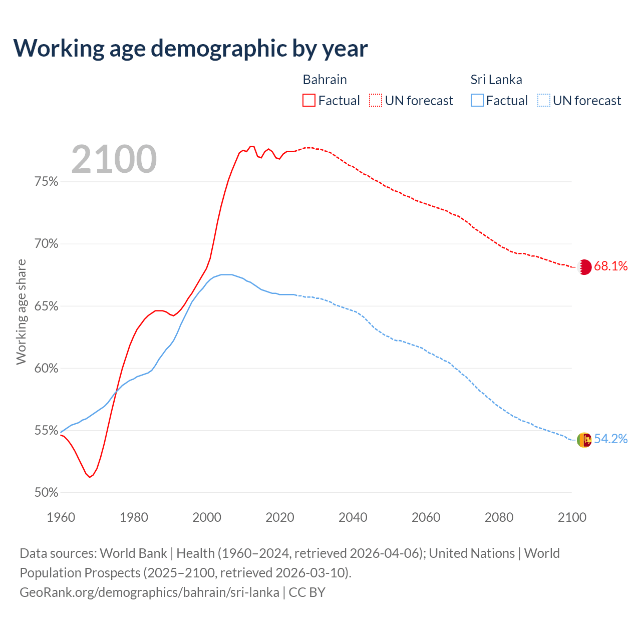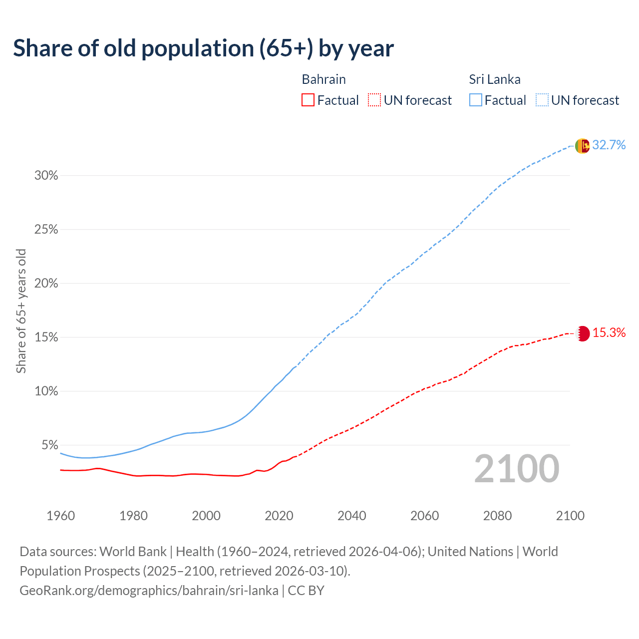 Median age Bahrain vs Sri Lanka, 1960-2100