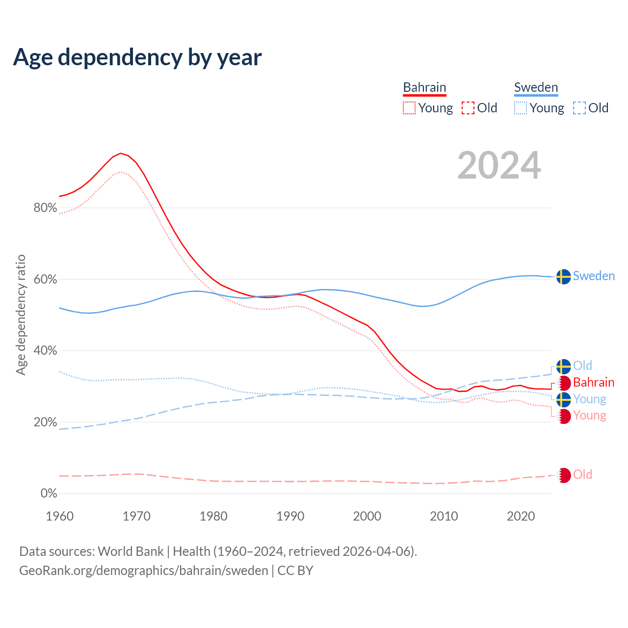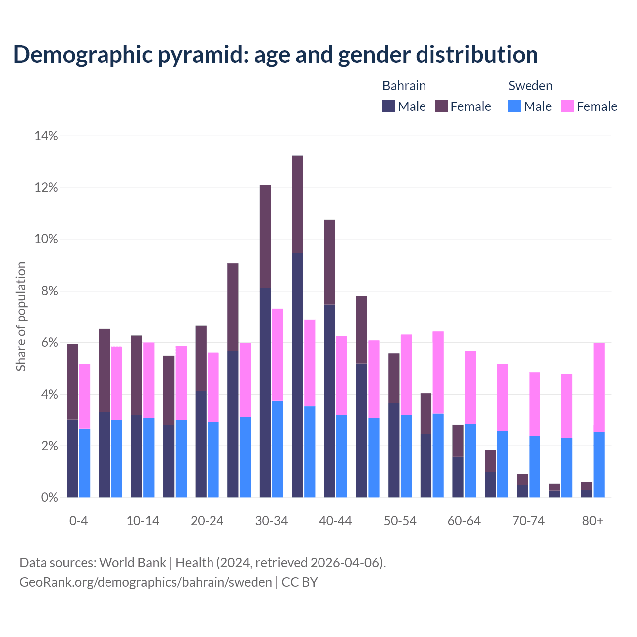 - Bahrain is ranked 80/196 by median age (oldest to youngest) vs 39/196 for Sweden.